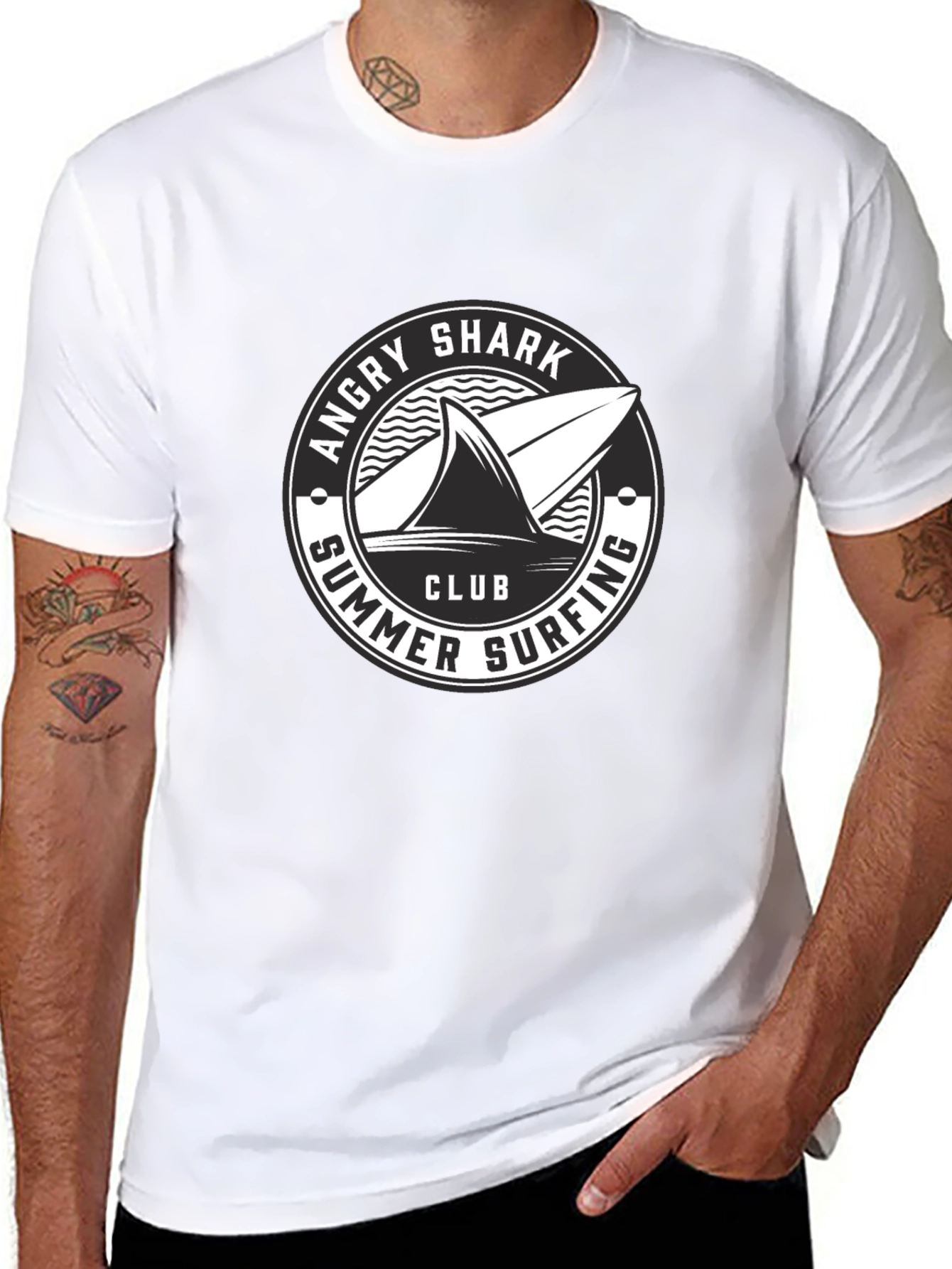 Show off your edgy style with this cool, black t-shirt. Featuring a circular graphic with a shark fin and surfboard design, along with the words 'Angry Shark Summer Surfing Club'. This tee is made from a soft fabric, perfect for casual wear. Great for beach days, summer outings, or just hanging out with friends, this shirt is sure to make a statement. Comfortable and stylish, it's a must-have for anyone who loves surfing and unique designs. Available in standard men's sizes.