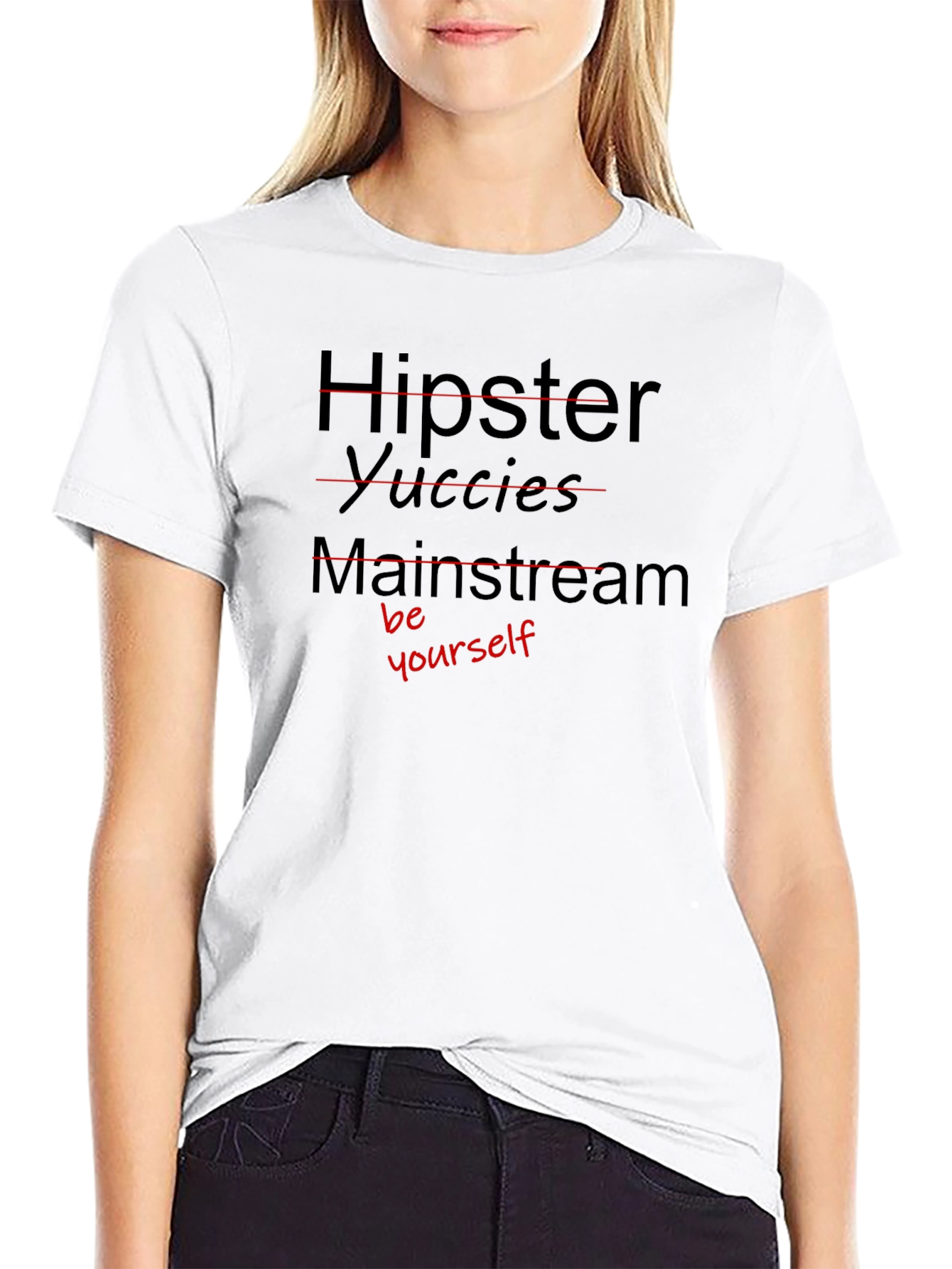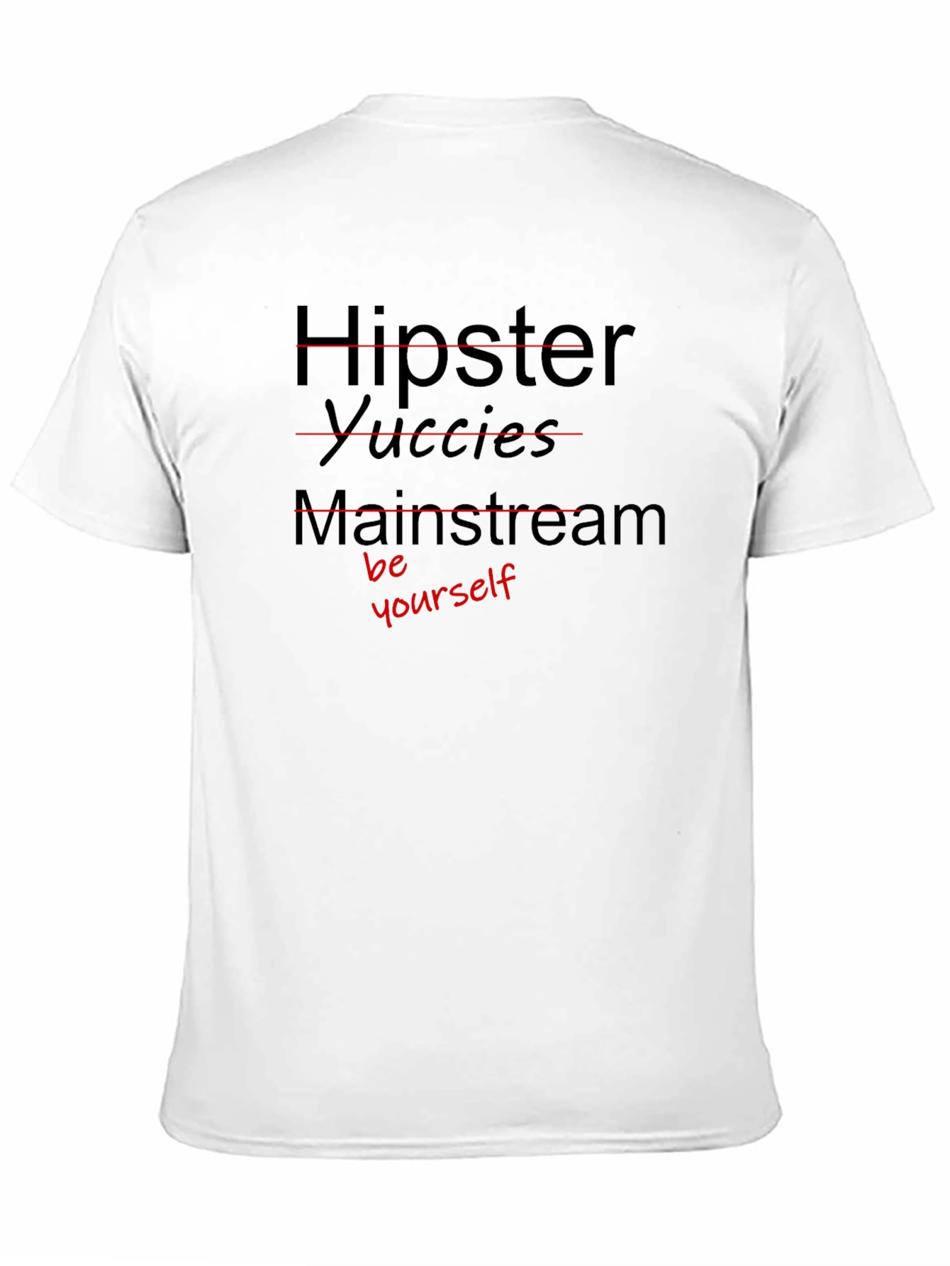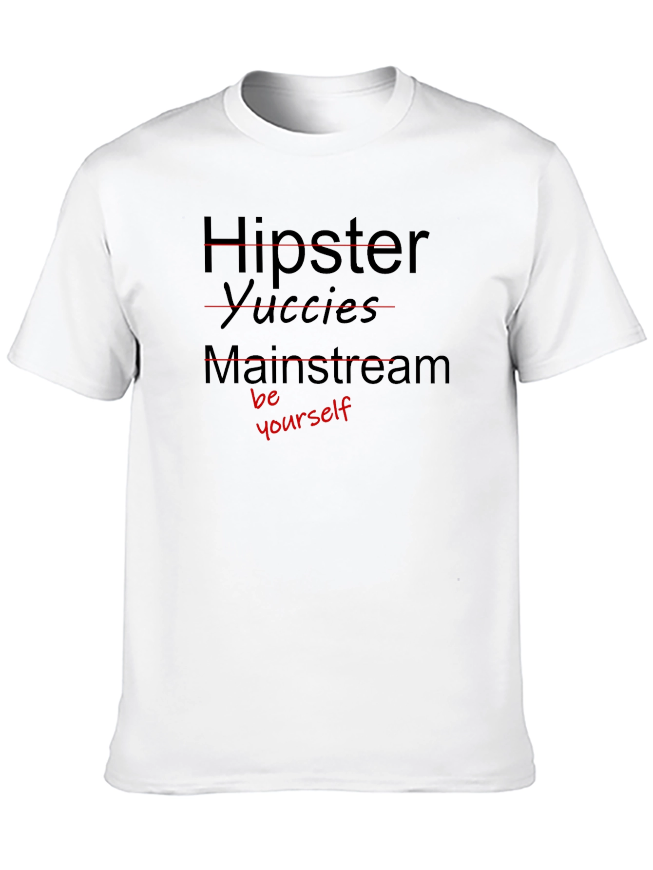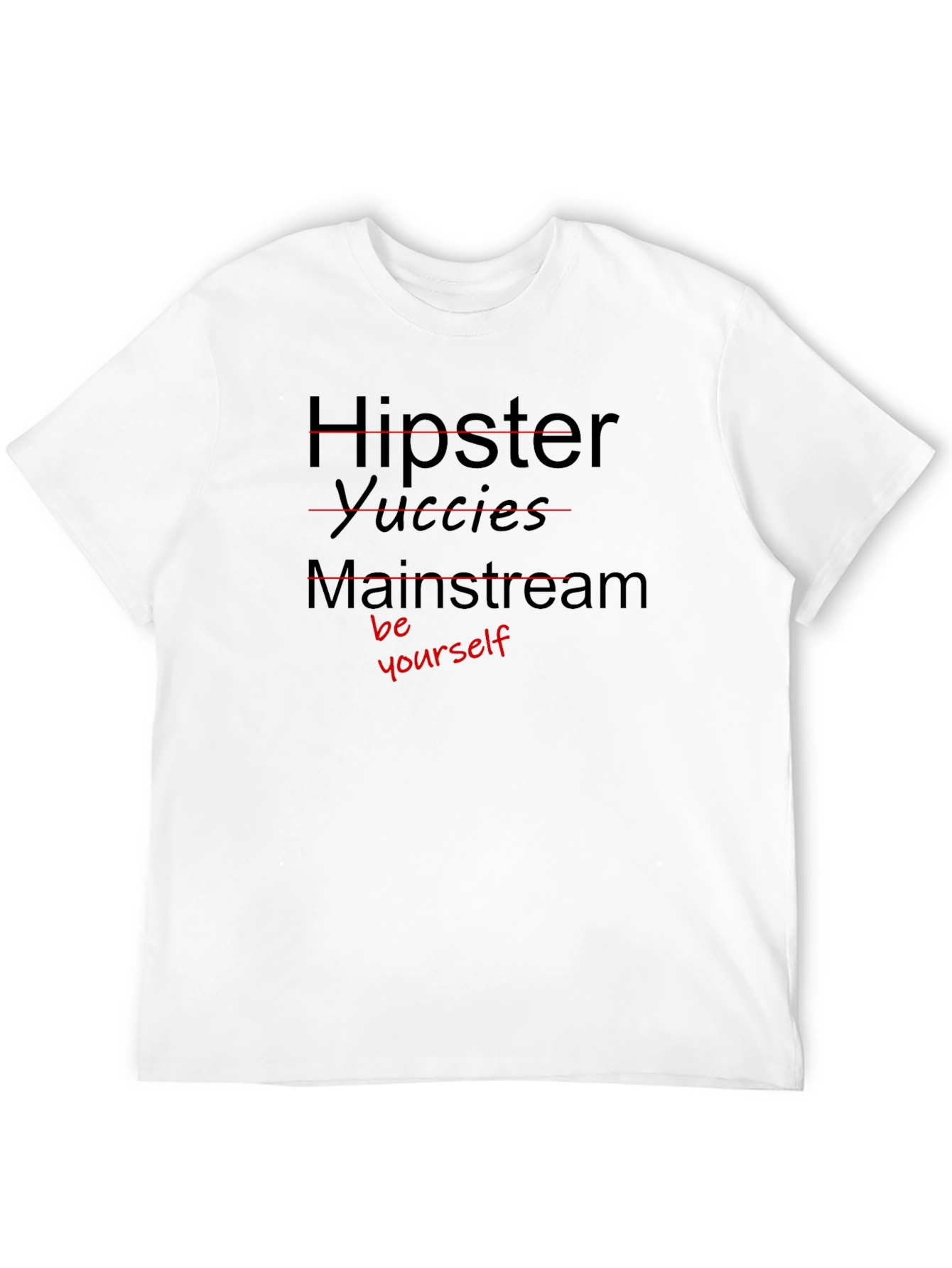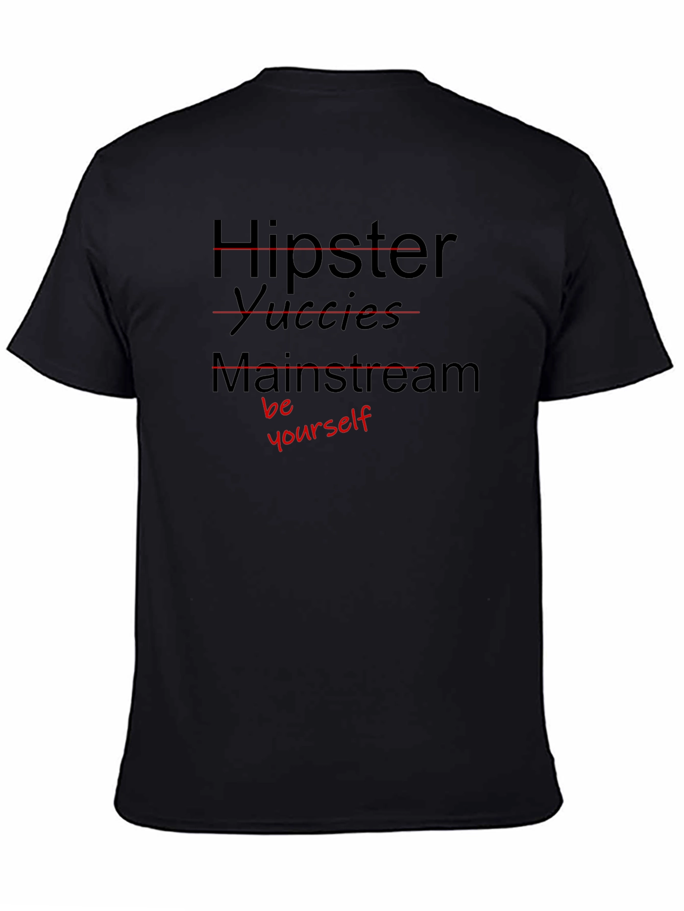 This black t-shirt features a unique design with the words "Hipster," "Yuccies," and "Mainstream" crossed out in red. Beneath these, the phrase "be yourself" is prominently displayed in red, encouraging individuality. The shirt has a classic crew neck and short sleeves, making it suitable for casual wear. The fabric appears to be a soft, breathable cotton blend, ensuring comfort. This tee is perfect for those who want to express their unique identity and stand out from the crowd. Wear it to social gatherings, casual outings, or simply as a statement piece.