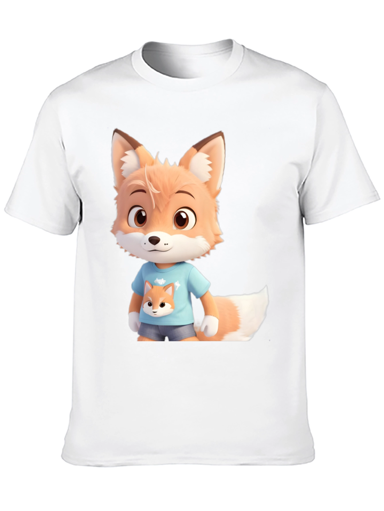 This trendy black t-shirt features an adorable cartoon fox character. The fox is depicted wearing a matching light blue shirt with its own image printed on it and grey shorts. This playful and eye-catching design is perfect for casual wear and makes a fun fashion statement. The shirt appears to be made from a comfortable, breathable fabric, ideal for everyday use. Great for animal lovers, cartoon enthusiasts, or anyone looking to add a touch of whimsy to their wardrobe, this tee is sure to turn heads and spark conversations. Pair it with jeans, shorts, or leggings for a relaxed and stylish look. A must-have for those who appreciate unique and cheerful apparel.
