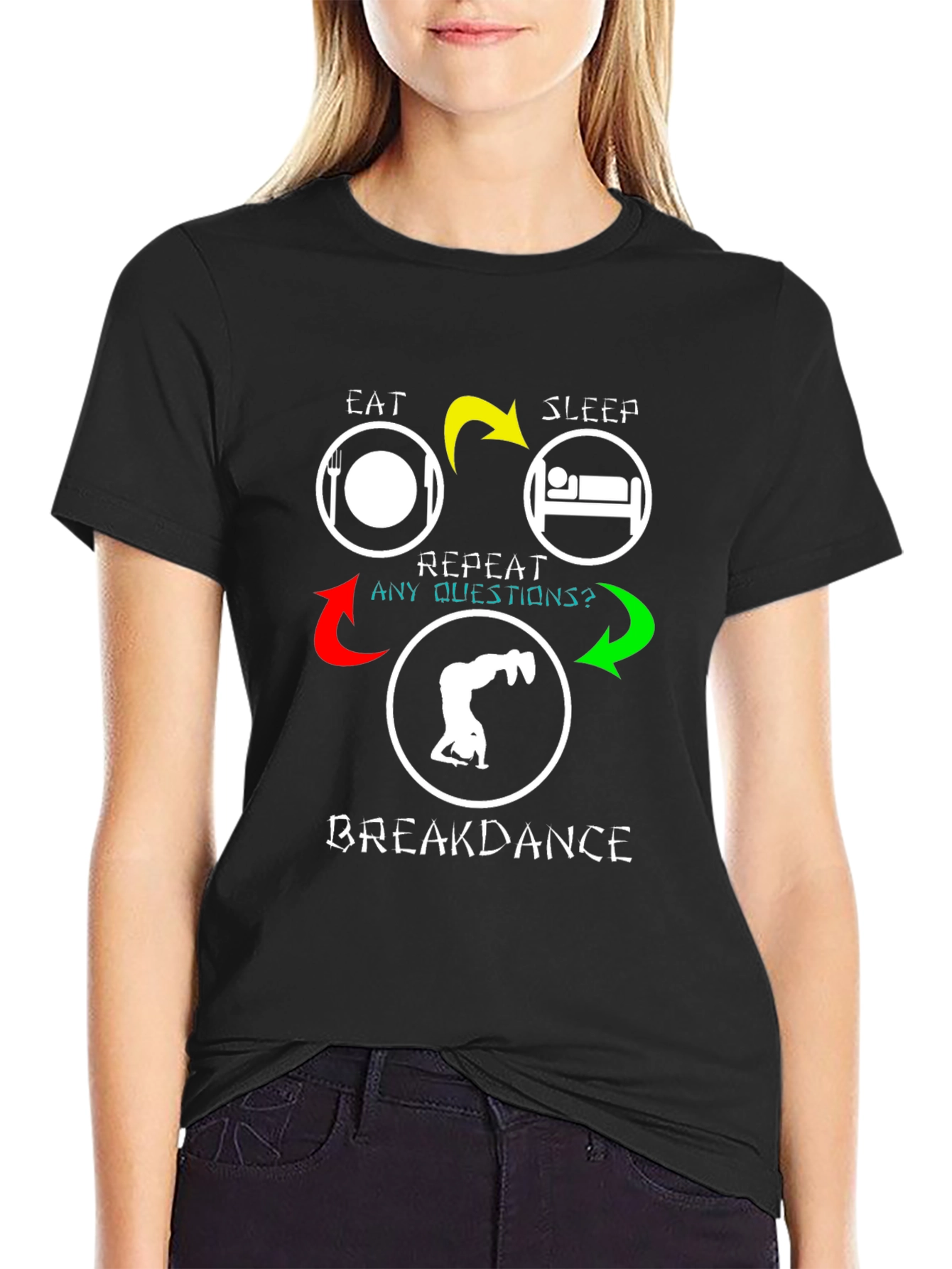 Show off your love for breakdancing with this unique graphic tee! This black t-shirt features a playful design of 'Eat, Sleep, Breakdance, Repeat' depicted in a circular flow, connected by colorful arrows. The fun design includes a plate, bed, and a breakdancing silhouette. The text 'ANY QUESTIONS?' adds a touch of humor. Made from a comfortable material, this tee is perfect for casual wear, dance practice, or as a gift for the breakdancer in your life. Express your passion with this eye-catching shirt!