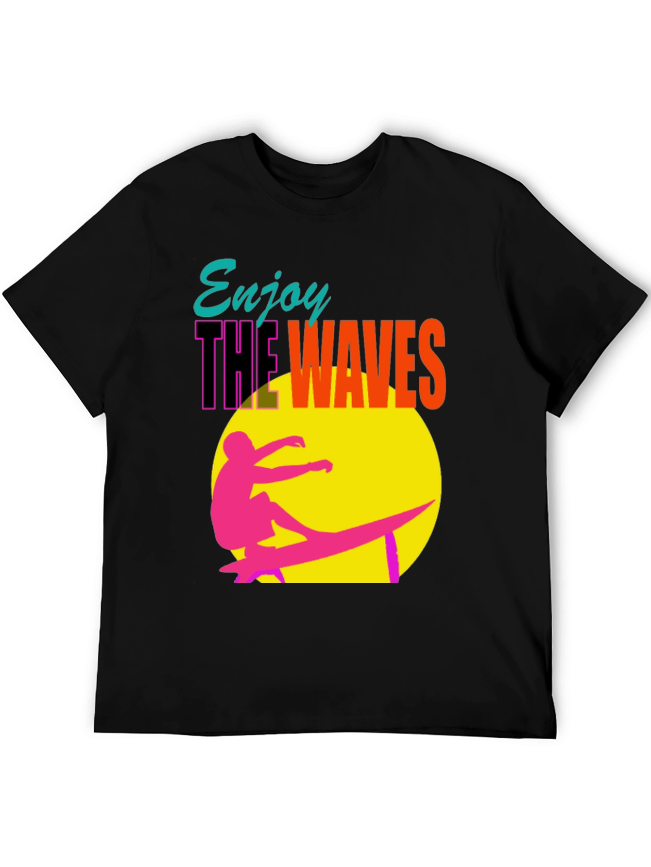 Catch the summer vibes with this cool black t-shirt featuring a vibrant and retro-inspired graphic design. The tee showcases a surfer silhouette set against a bright yellow sun, complemented by the words "Enjoy The Waves" in eye-catching teal, pink, and orange. Made from what appears to be comfortable cotton fabric, this t-shirt is perfect for casual outings, beach days, or simply expressing your love for surfing. Its unique design makes it a standout piece, perfect for those who love fun, colorful, and sporty apparel. Grab yours and ride the wave of style!