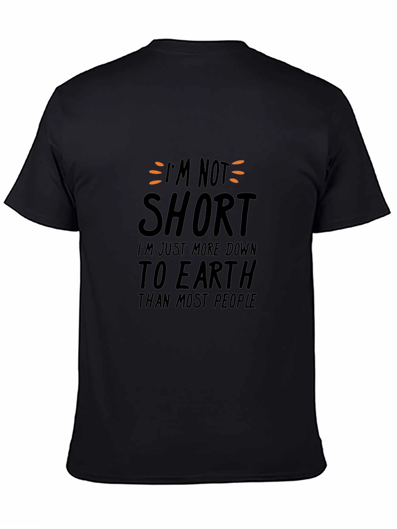 This classic black t-shirt features a humorous graphic print that reads "I'M NOT SHORT I'M JUST MORE DOWN TO EARTH THAN MOST PEOPLE". The playful text is adorned with stylish orange accents. Made from what appears to be a soft and comfortable cotton blend, this tee offers a relaxed fit, making it perfect for everyday wear. Its short sleeves and crew neck design ensure a casual and versatile style, ideal for pairing with jeans, shorts, or casual pants. This tee is a fun and lighthearted way to express your personality and add a touch of humor to your wardrobe.