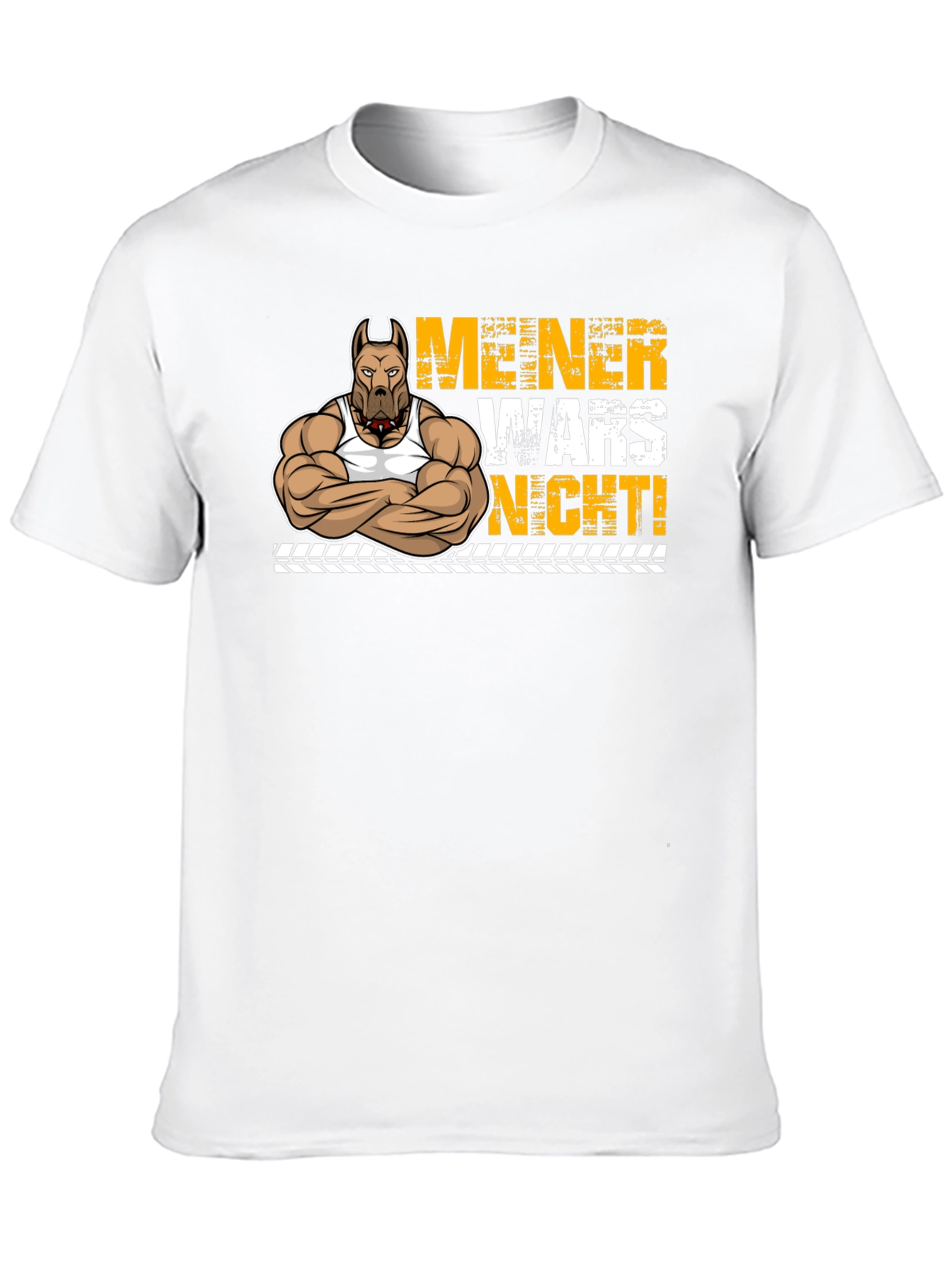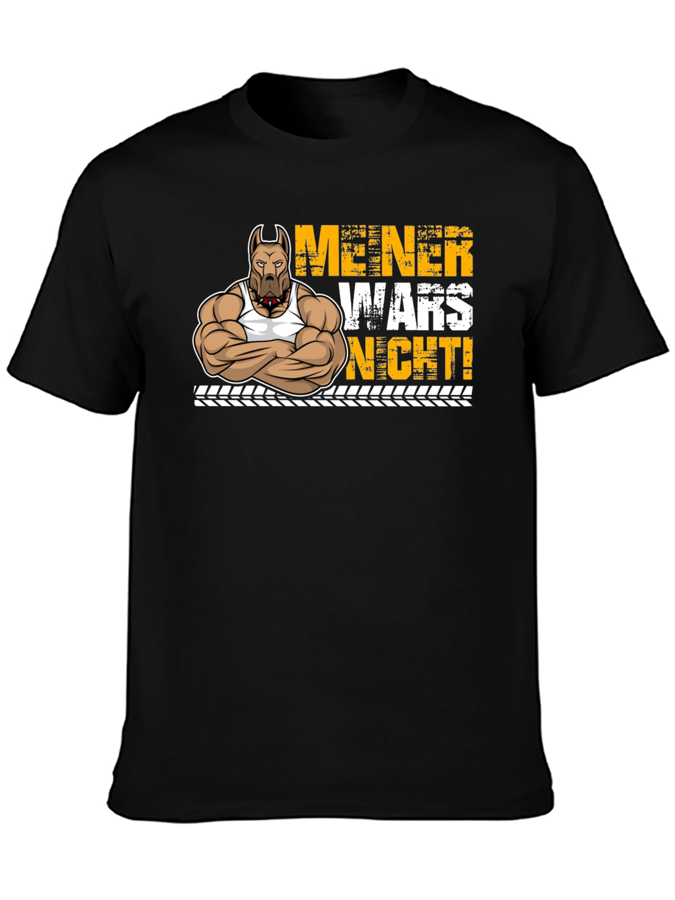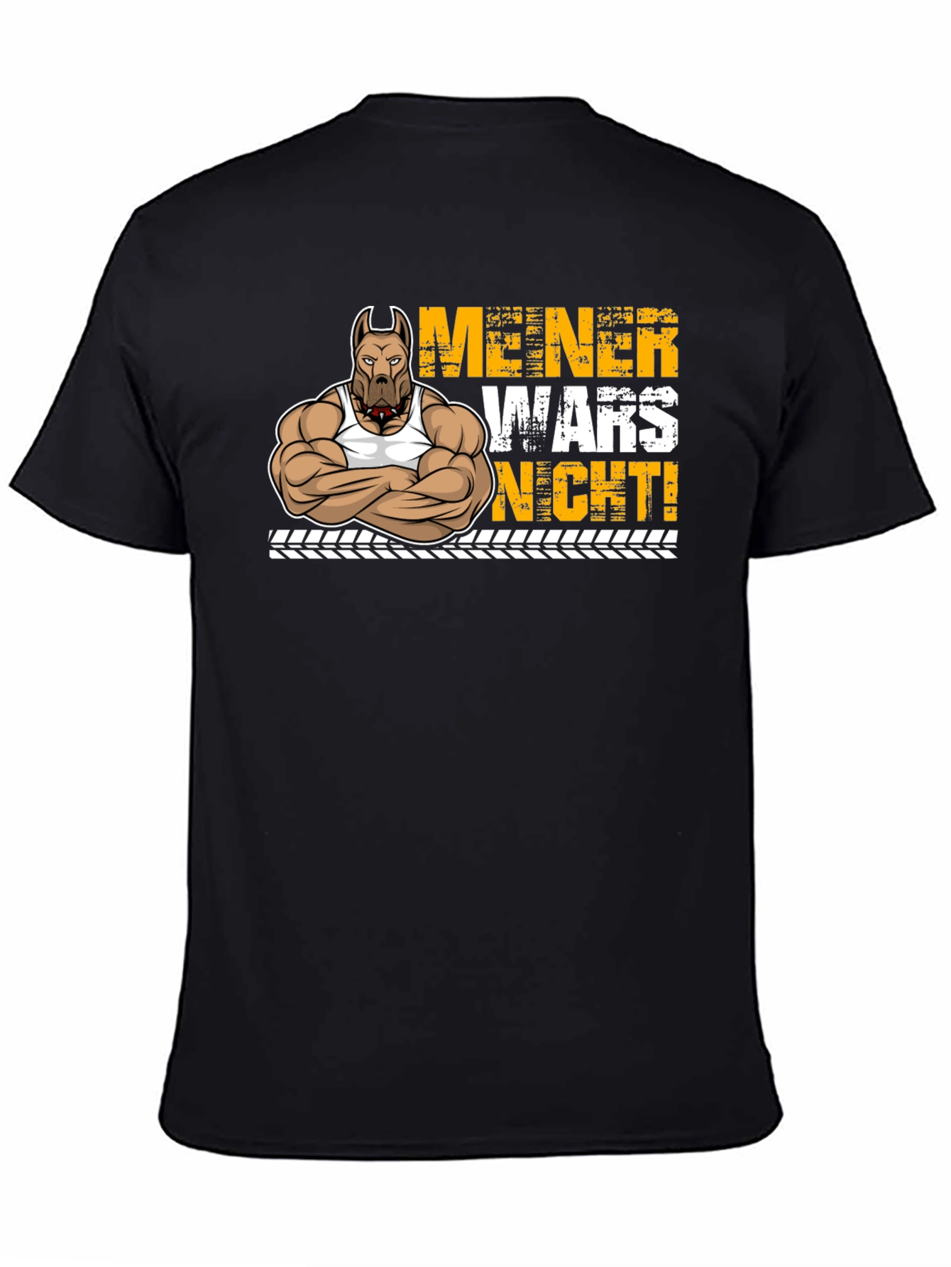 This unique t-shirt features a cartoon illustration of a muscular pitbull wearing a tank top. The design includes bold yellow lettering in German, that reads "MEINER WARS NICHT!" The print is set against a black background and below the lettering is a tire track design. The shirt itself appears to be made from a soft, comfortable cotton blend. Its short sleeves and crew neck make it ideal for casual wear, trips to the gym, or showing off your fun style. This playful tee will definitely be a great conversation starter!