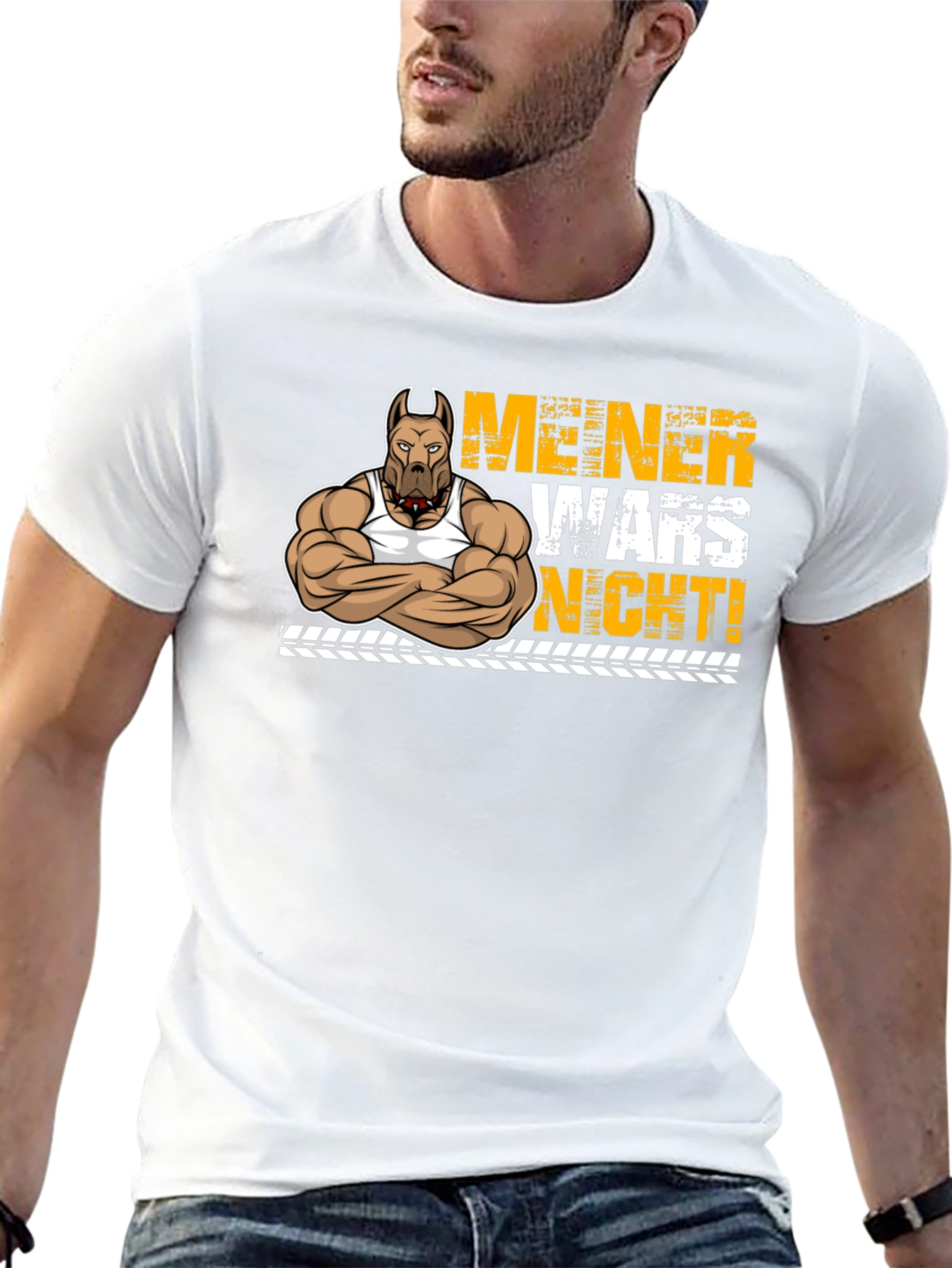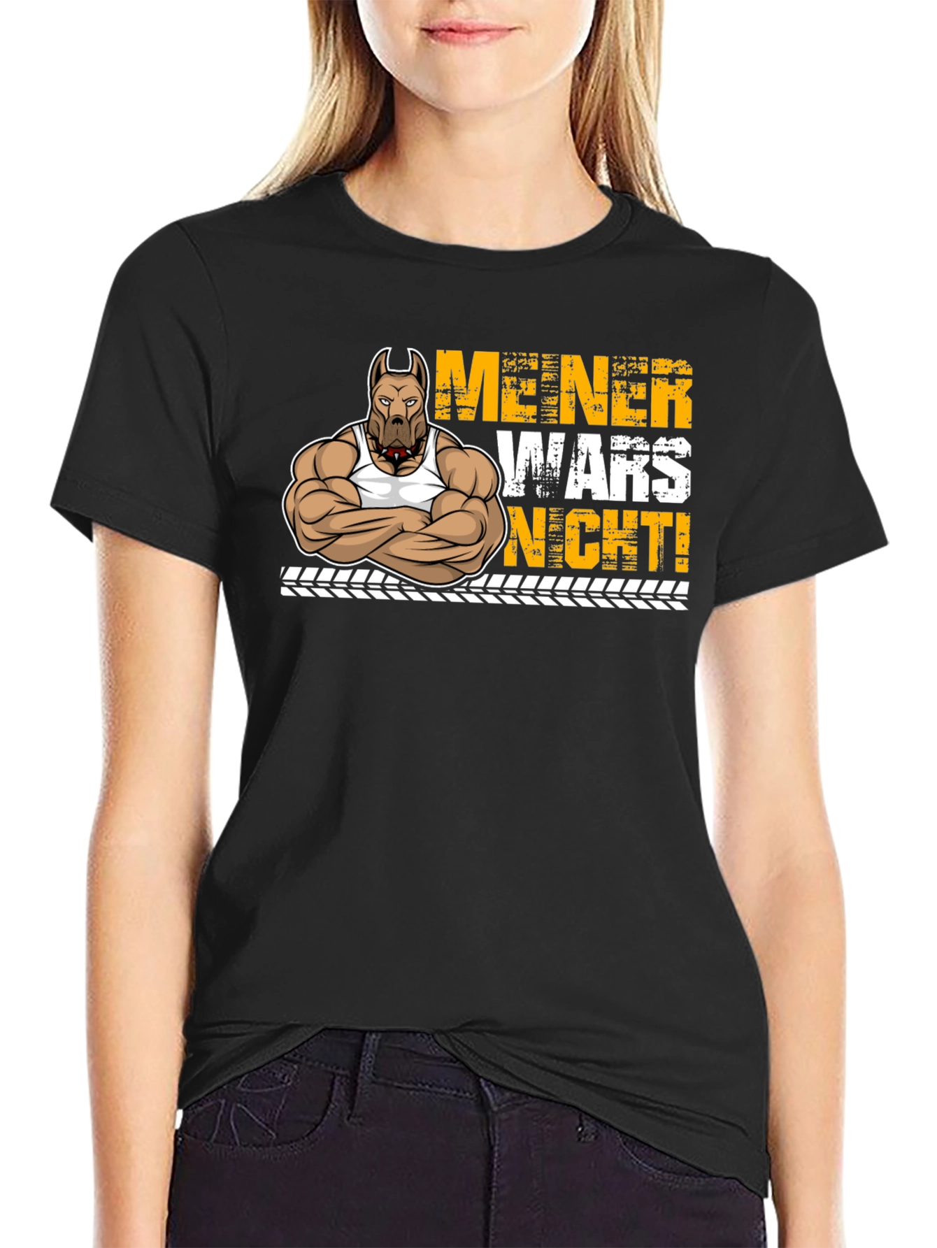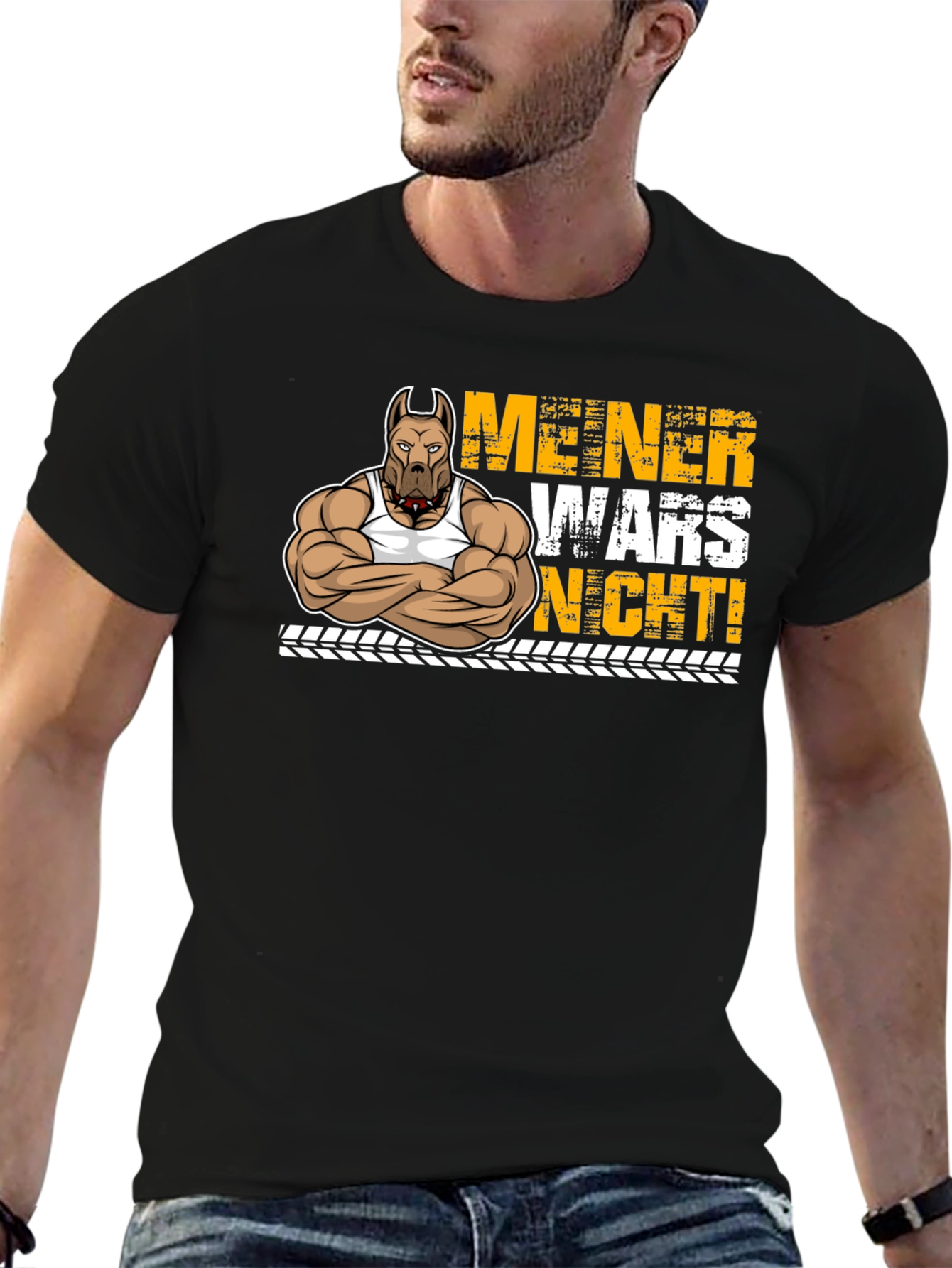 This unique t-shirt features a cartoon illustration of a muscular pitbull wearing a tank top. The design includes bold yellow lettering in German, that reads "MEINER WARS NICHT!" The print is set against a black background and below the lettering is a tire track design. The shirt itself appears to be made from a soft, comfortable cotton blend. Its short sleeves and crew neck make it ideal for casual wear, trips to the gym, or showing off your fun style. This playful tee will definitely be a great conversation starter!