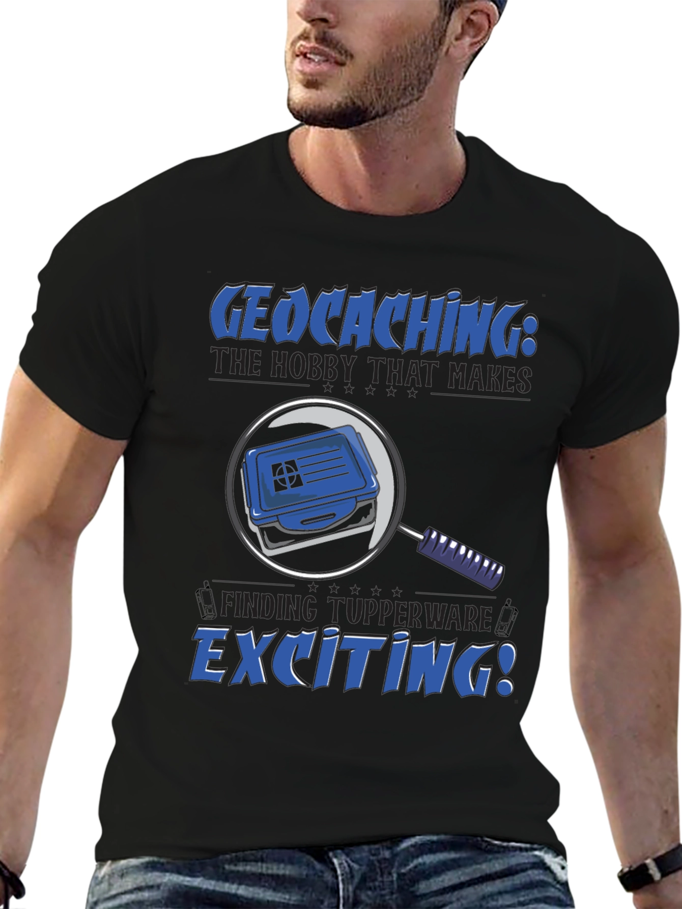 Show off your love for geocaching with this unique t-shirt! The black tee features a fun design with the phrase "Geocaching: The Hobby That Makes Finding Tupperware EXCITING!" in a bold, eye-catching font. The graphic also includes an image of a geocache container under a magnifying glass, adding to the playful theme. Made from what appears to be a soft, comfortable cotton blend, this shirt is perfect for everyday wear, especially on your geocaching adventures. It's a great conversation starter and a fun way to connect with fellow geocachers. Whether you're searching for hidden treasures in the woods or attending a geocaching event, this t-shirt is sure to be a hit!