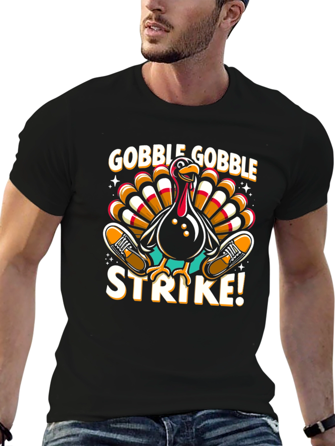 This unique black t-shirt features a fun and festive design perfect for Thanksgiving or any bowling enthusiast. The graphic showcases a cartoon turkey cleverly designed as a bowling ball, complete with colorful tail feathers resembling bowling pins and stylish bowling shoes. The phrase 'GOBBLE GOBBLE STRIKE!' is printed in a bold, eye-catching font above and below the turkey, adding to the playful theme. Made from what appears to be a soft and comfortable fabric, this tee is ideal for casual wear, bowling events, or holiday gatherings. Show off your love for bowling and Thanksgiving with this conversation-starting t-shirt!