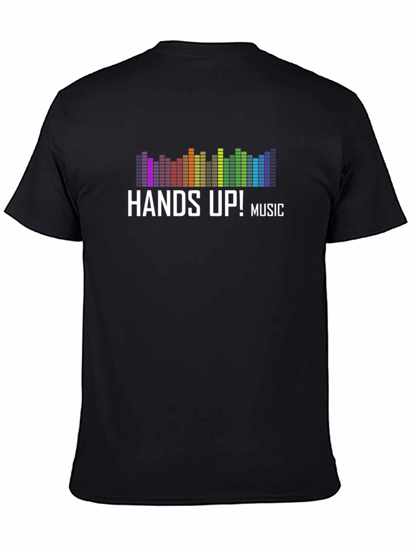 Show your love for music with this stylish black T-shirt. Featuring a vibrant, colorful equalizer design, accompanied by the phrase 'Hands Up! Music,' this shirt is perfect for music lovers and concert-goers. The design includes vertical bars in a rainbow of colors, creating an eye-catching visual. Made from what appears to be a soft, comfortable cotton blend, this tee offers both style and comfort. Ideal for casual wear, concerts, music festivals, or simply expressing your passion for great tunes. Grab yours today and let the music move you!