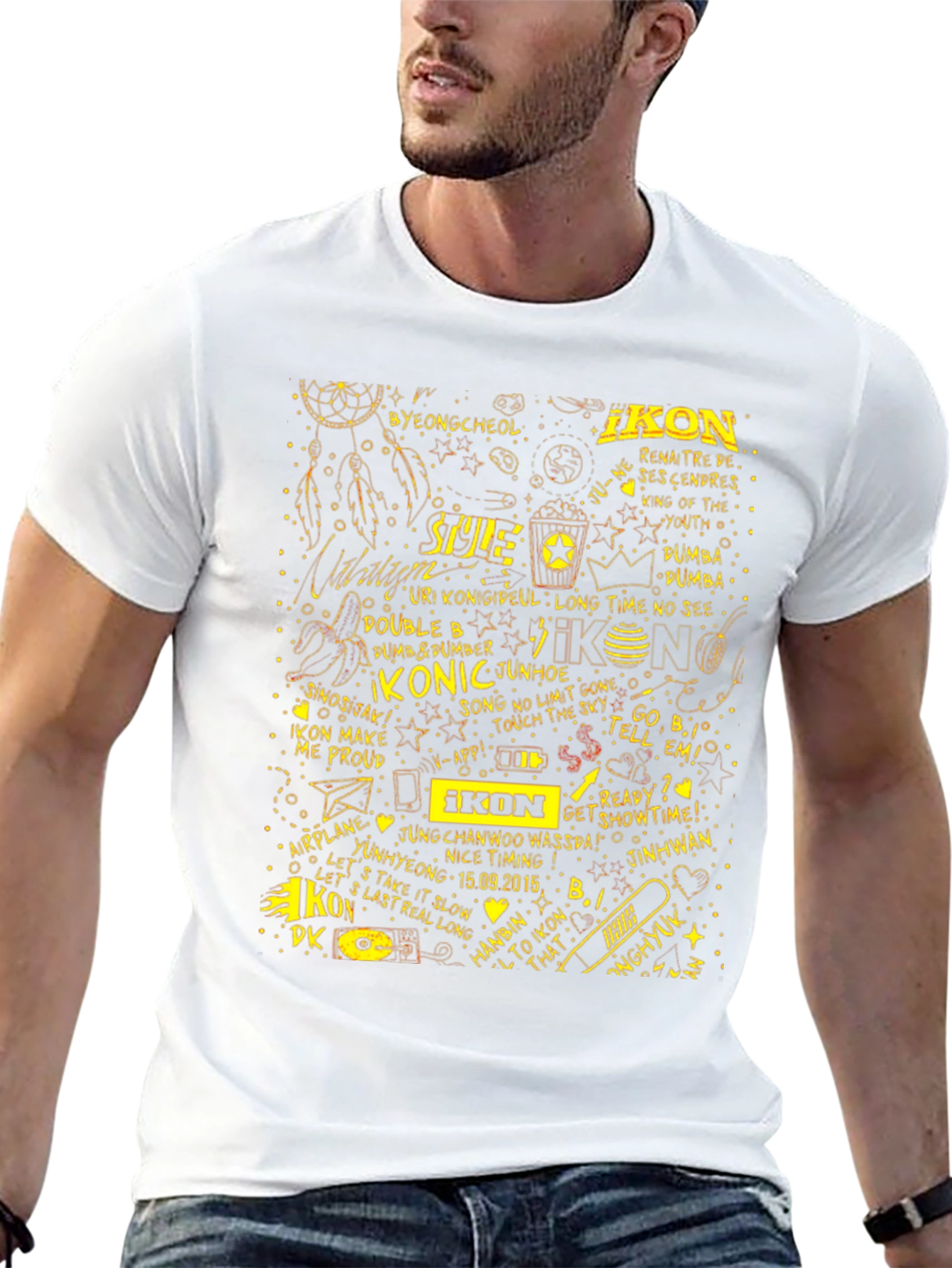 Show your love for iKON with this stylish black t-shirt. This tee features a vibrant yellow graphic print showcasing the band's name and song titles. The intricate design includes various elements such as a popcorn graphic, and phrases in a graffiti style, adding an edgy and unique touch. Made from a comfortable-looking fabric, this shirt is perfect for everyday wear or for showing your support at concerts and events. A must-have for any iKON fan, this t-shirt is sure to turn heads and spark conversations.