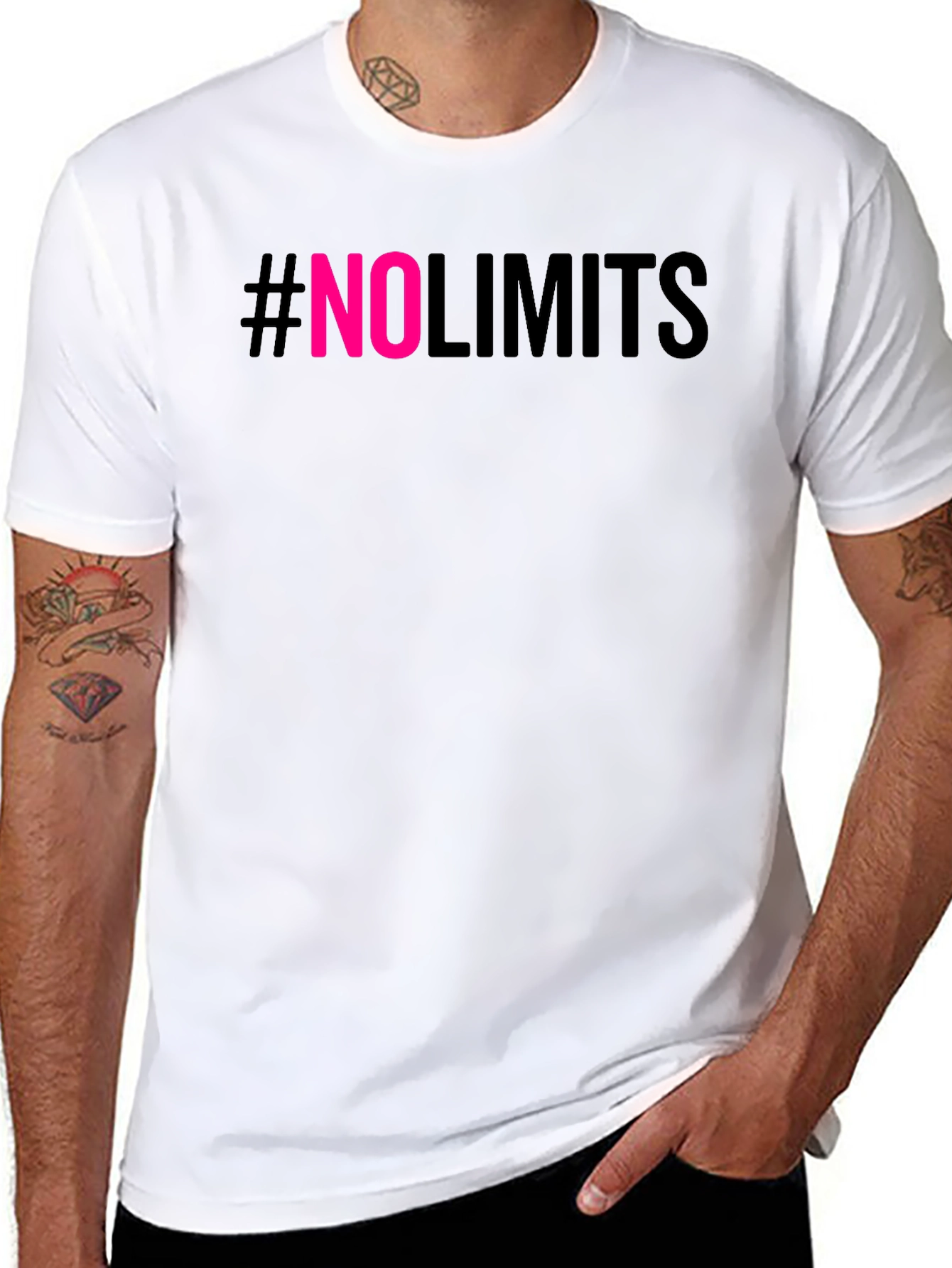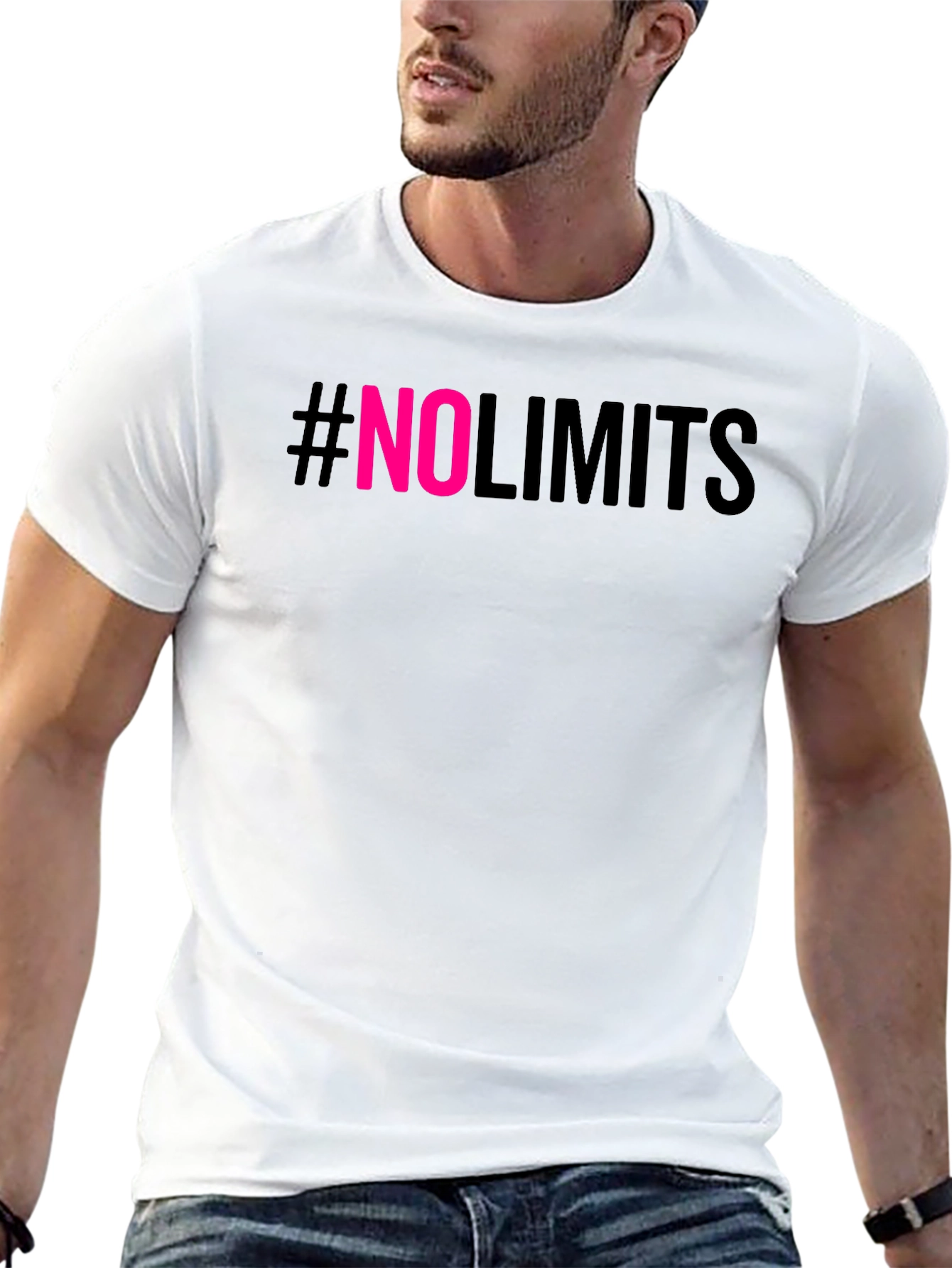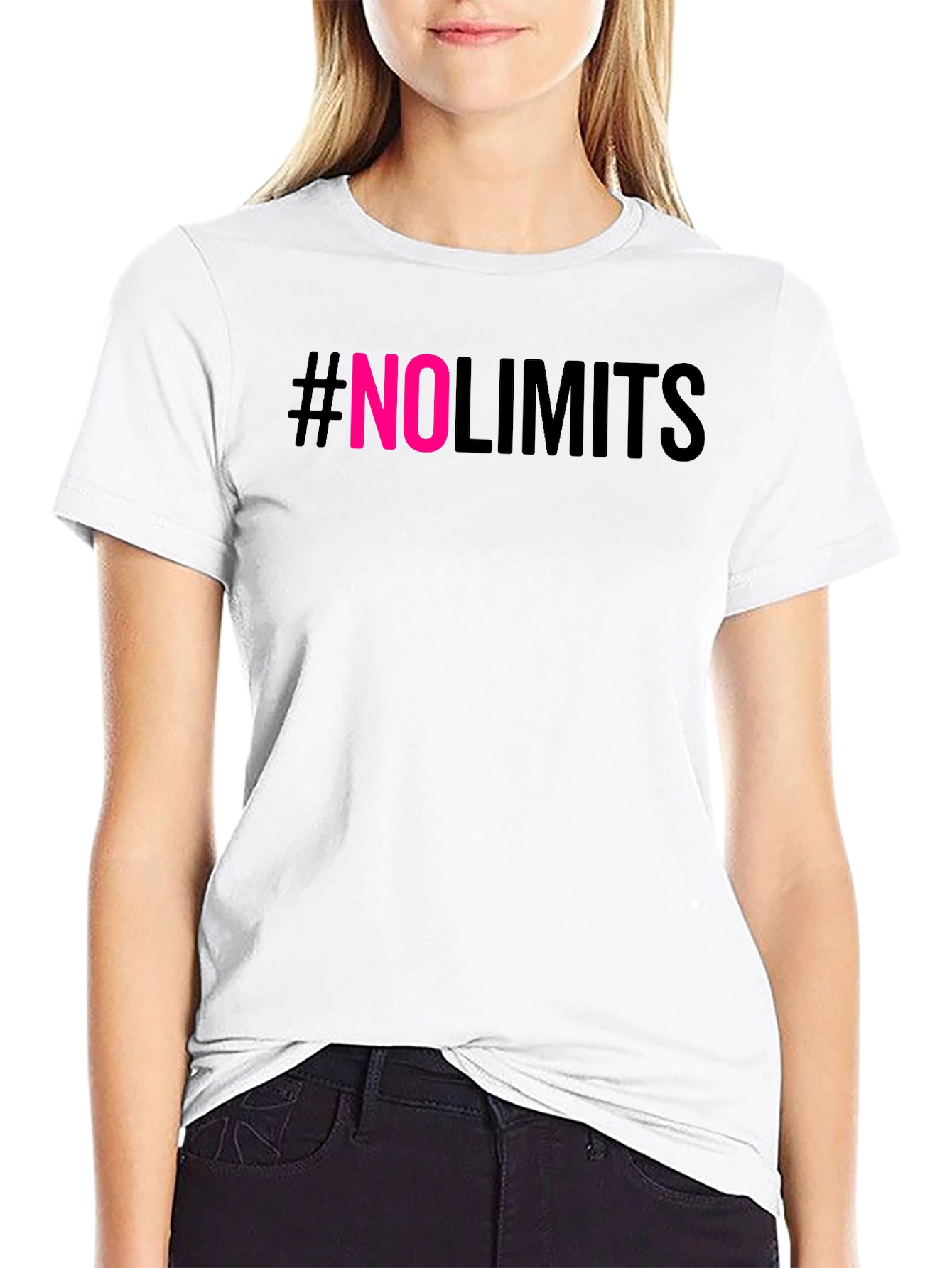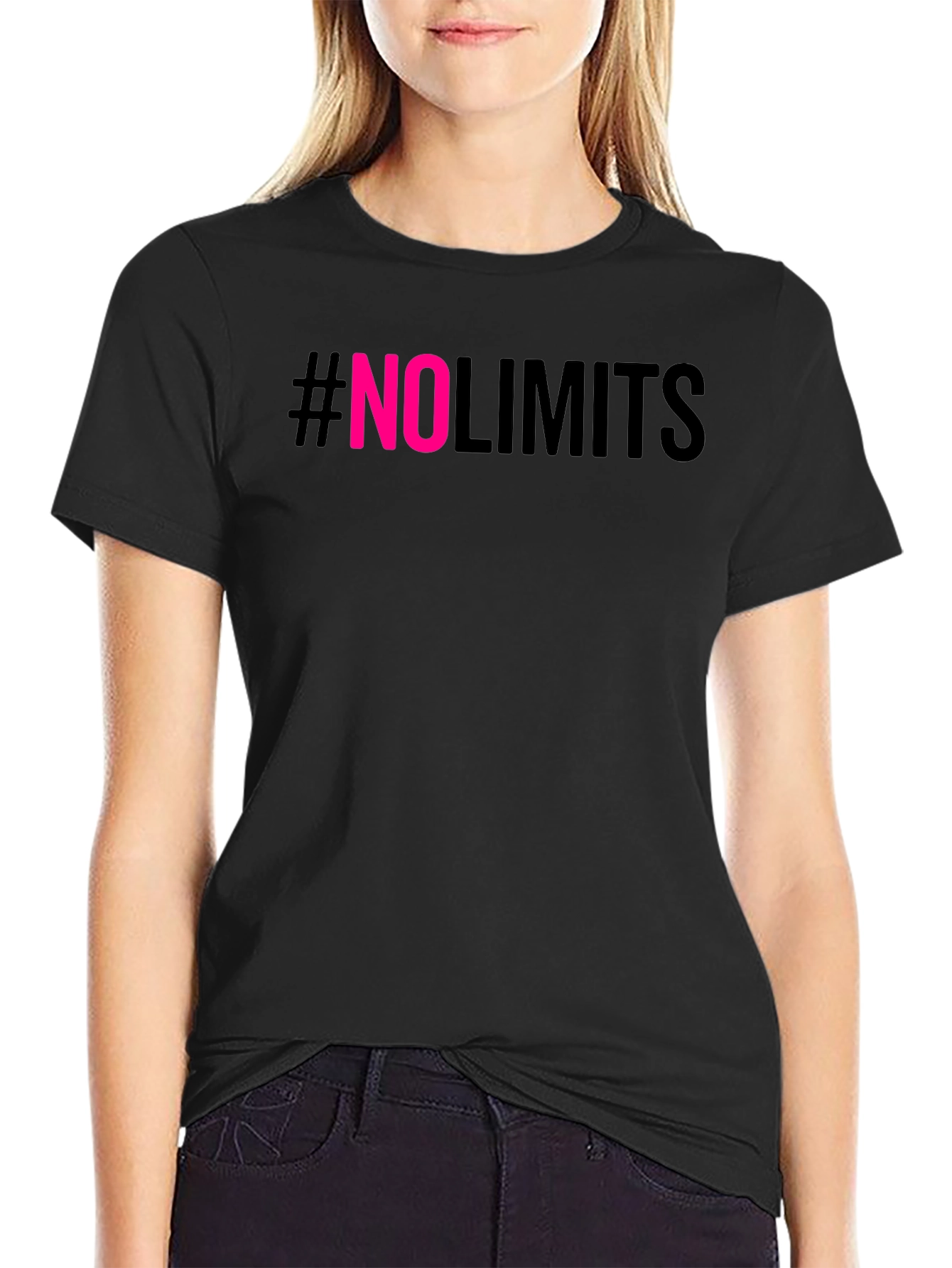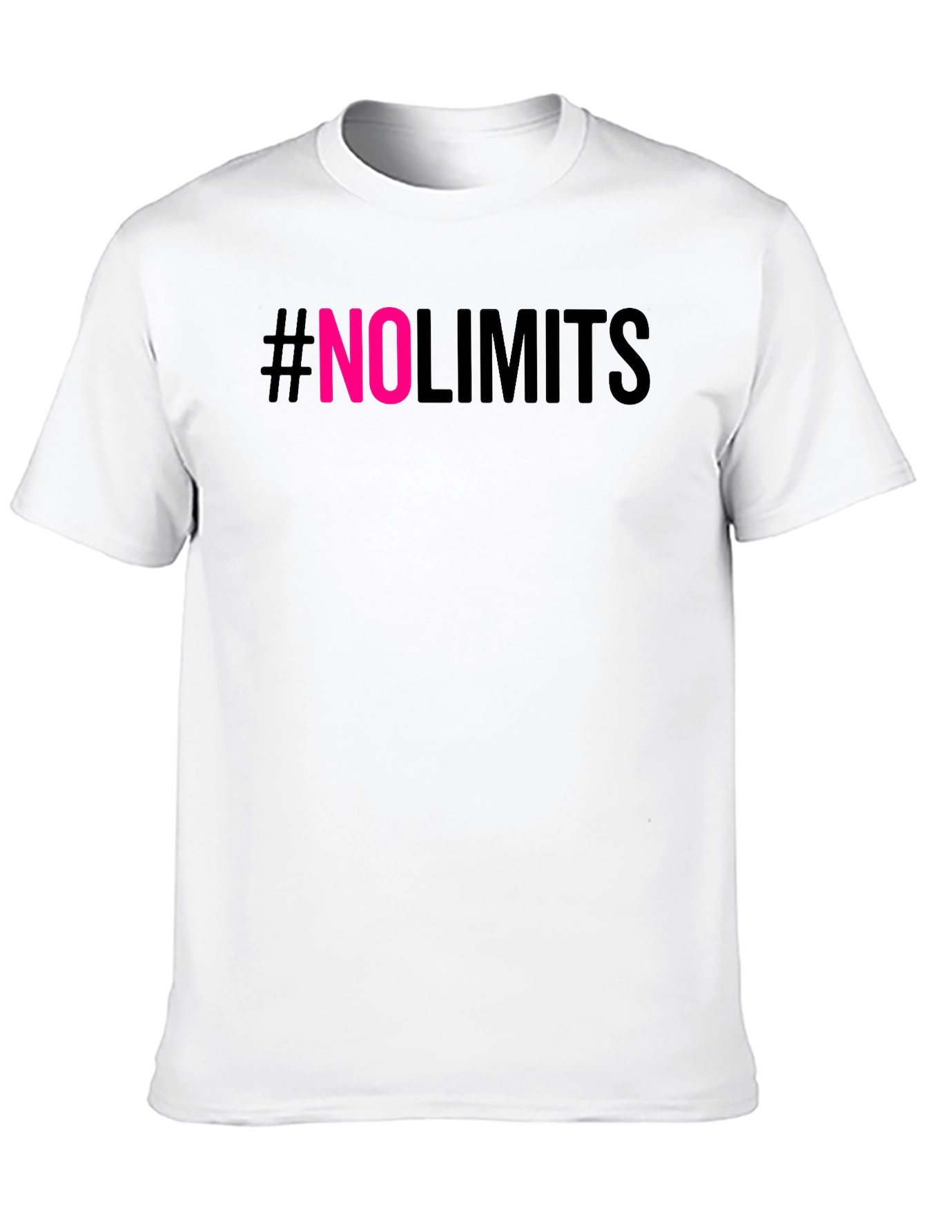 Showcase your ambition with this bold #NoLimits graphic t-shirt. Featuring a sleek black backdrop with striking pink "NO" lettering, this tee makes a statement. The comfortable, casual fit is ideal for everyday wear, whether you're hitting the gym, hanging out with friends, or just expressing your limitless mindset. The short sleeves and classic crew neck offer a versatile look that pairs effortlessly with jeans, shorts, or joggers. Make a statement and inspire those around you to push their limits!