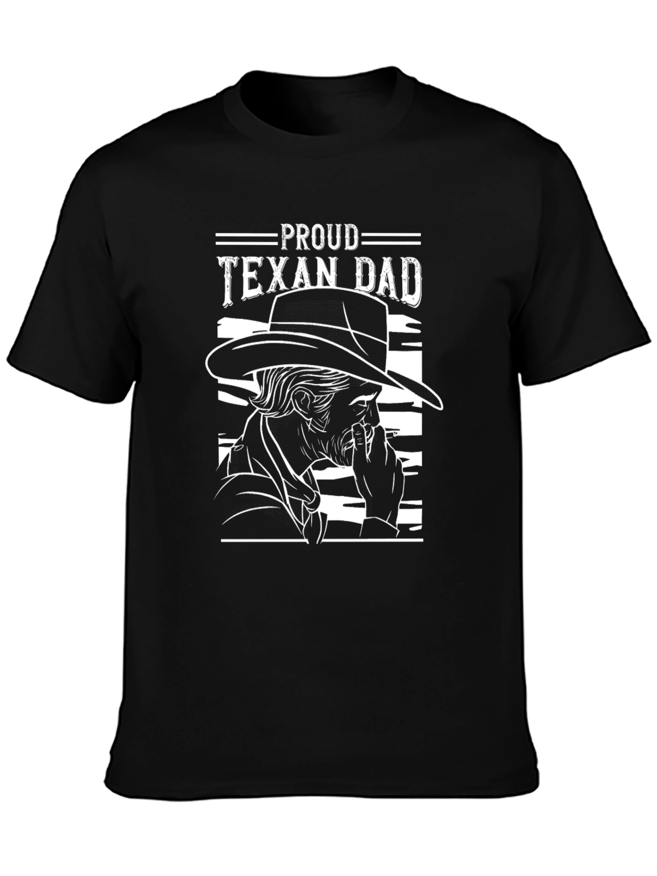 Show off your Texas pride with this bold black graphic tee! Featuring a striking illustration of a Texan gentleman with the words 'Proud Texan Dad,' this shirt is perfect for fathers who love their state. The design showcases a cowboy hat and beard in a cool, stylish font, creating a unique and eye-catching look. Made from comfortable, breathable fabric, this t-shirt is ideal for casual wear, family gatherings, or showing your Texas spirit at any event. A perfect gift for dads who are proud Texans!
