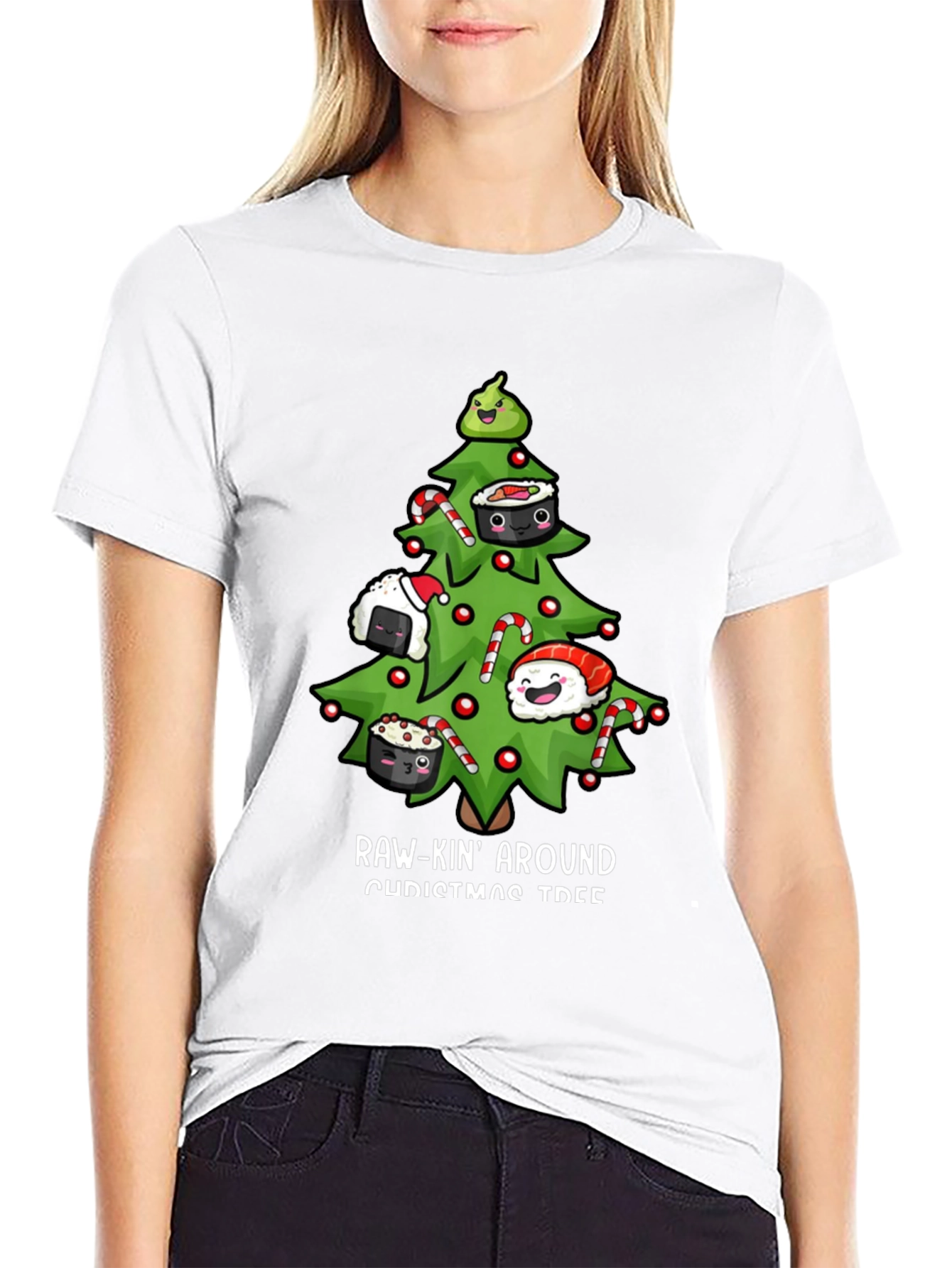 Get festive with this fun and unique black t-shirt! It features a playful design of a Christmas tree decorated with adorable sushi characters. The tree is adorned with sushi rolls wearing Santa hats, wasabi toppers, and candy cane accents, all under the clever slogan "RAW-KIN' AROUND CHRISTMAS TREE". This comfortable and eye-catching tee is perfect for sushi lovers and anyone who wants to add a touch of humor to their holiday wardrobe. Wear it to holiday parties, sushi nights, or just spread some cheer during the Christmas season. Made with a soft and breathable fabric for all-day comfort, this t-shirt is sure to be a conversation starter and a festive favorite!