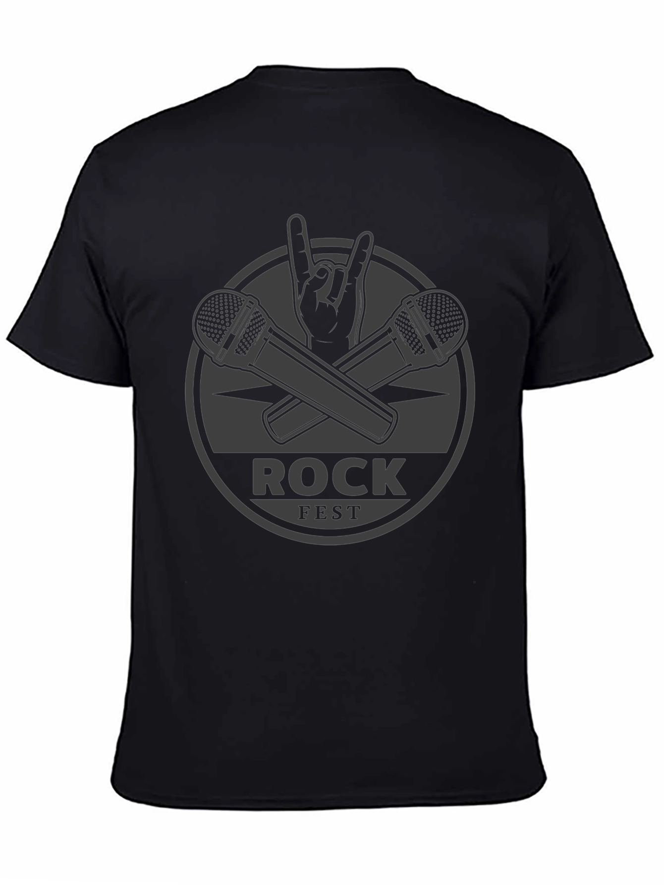 Show your love for rock music with this cool black t-shirt. Featuring a stylized "Rock Fest" design, complete with crossed microphones and a classic rock hand symbol, this tee is perfect for concerts, festivals, or everyday wear. The graphic is printed in a subtle grey tone, giving the shirt a stylish look. Made from comfortable material, this t-shirt offers a relaxed fit that¡¯s great for any casual occasion. It's a must-have for rock enthusiasts.