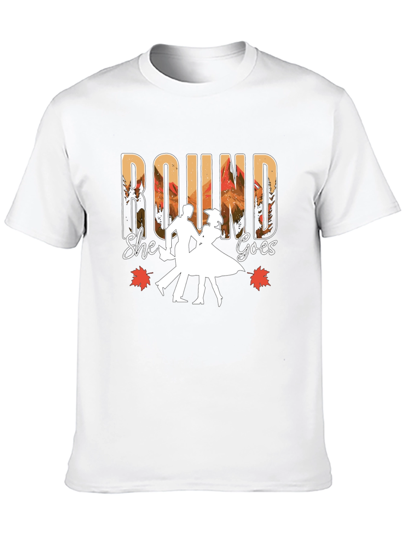 Embrace the charm of autumn with this stylish black t-shirt featuring a unique 'Round She Goes' design. The graphic showcases a silhouette of a dancing couple, reminiscent of a classic fall harvest festival. The word "ROUND" is artistically filled with a warm-toned landscape that makes this t-shirt stand out. Autumn leaves add a touch of seasonal elegance. Ideal for casual wear, themed parties, or as a thoughtful gift. Made from a comfortable-looking fabric, this tee offers both style and ease.