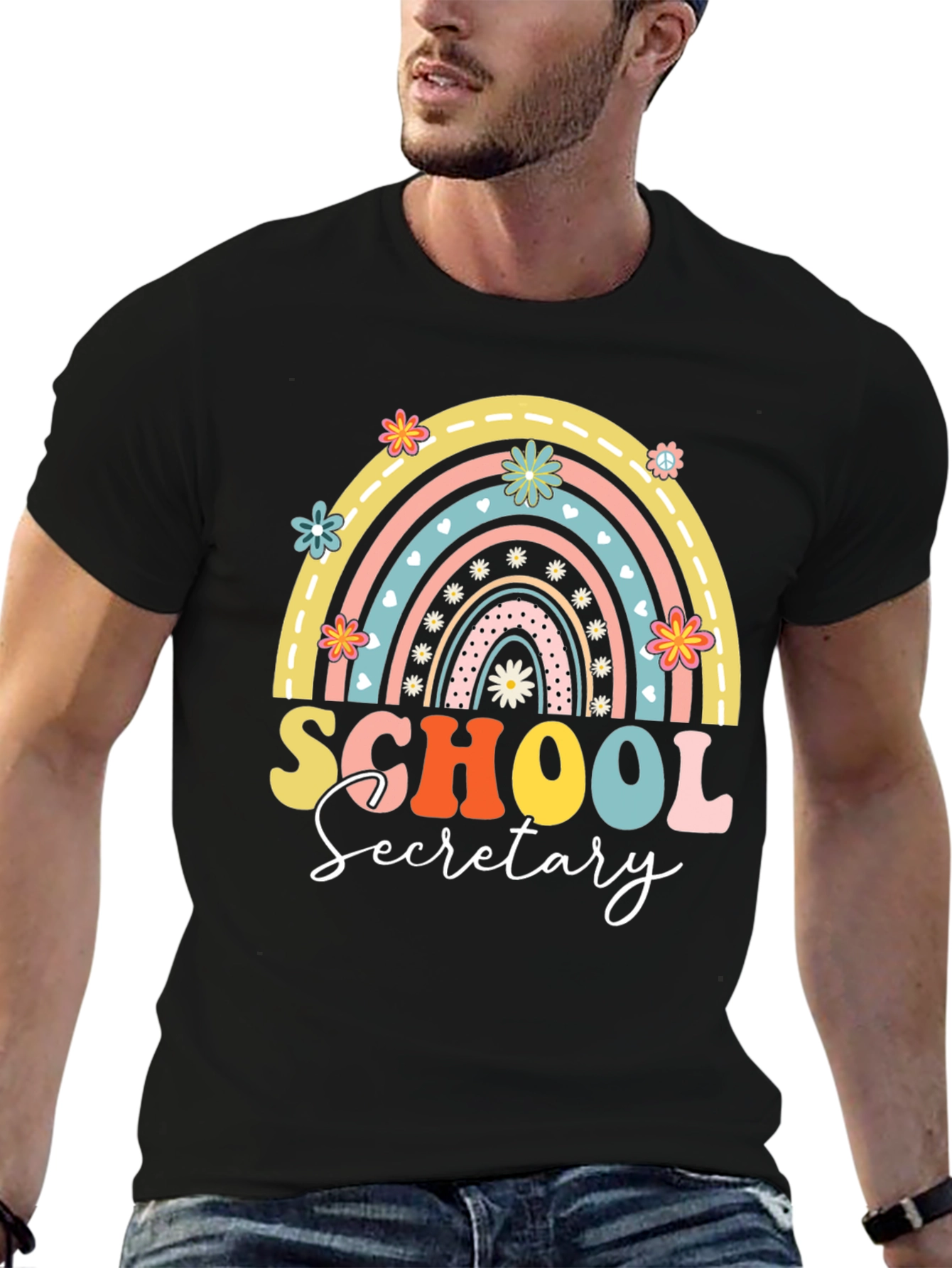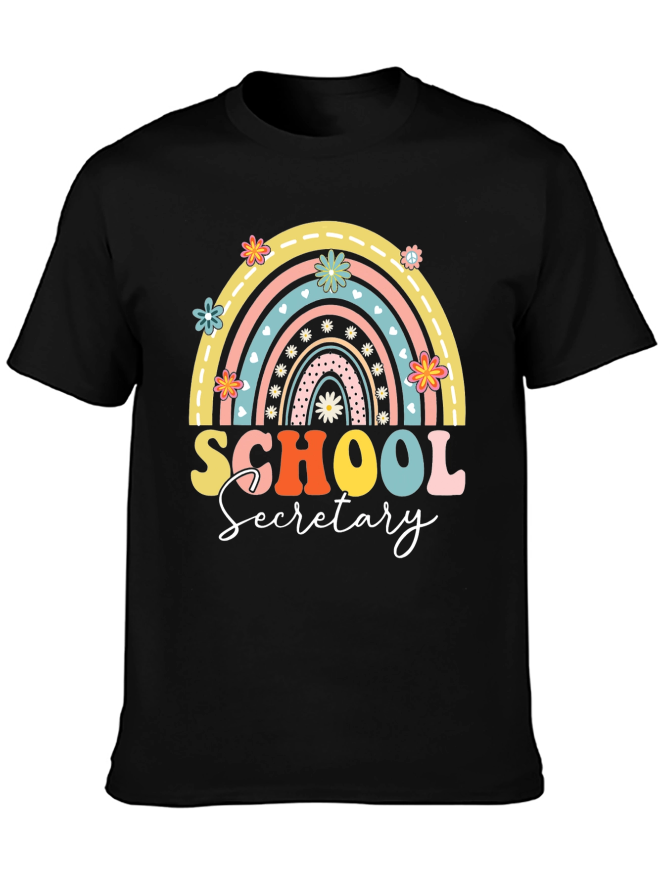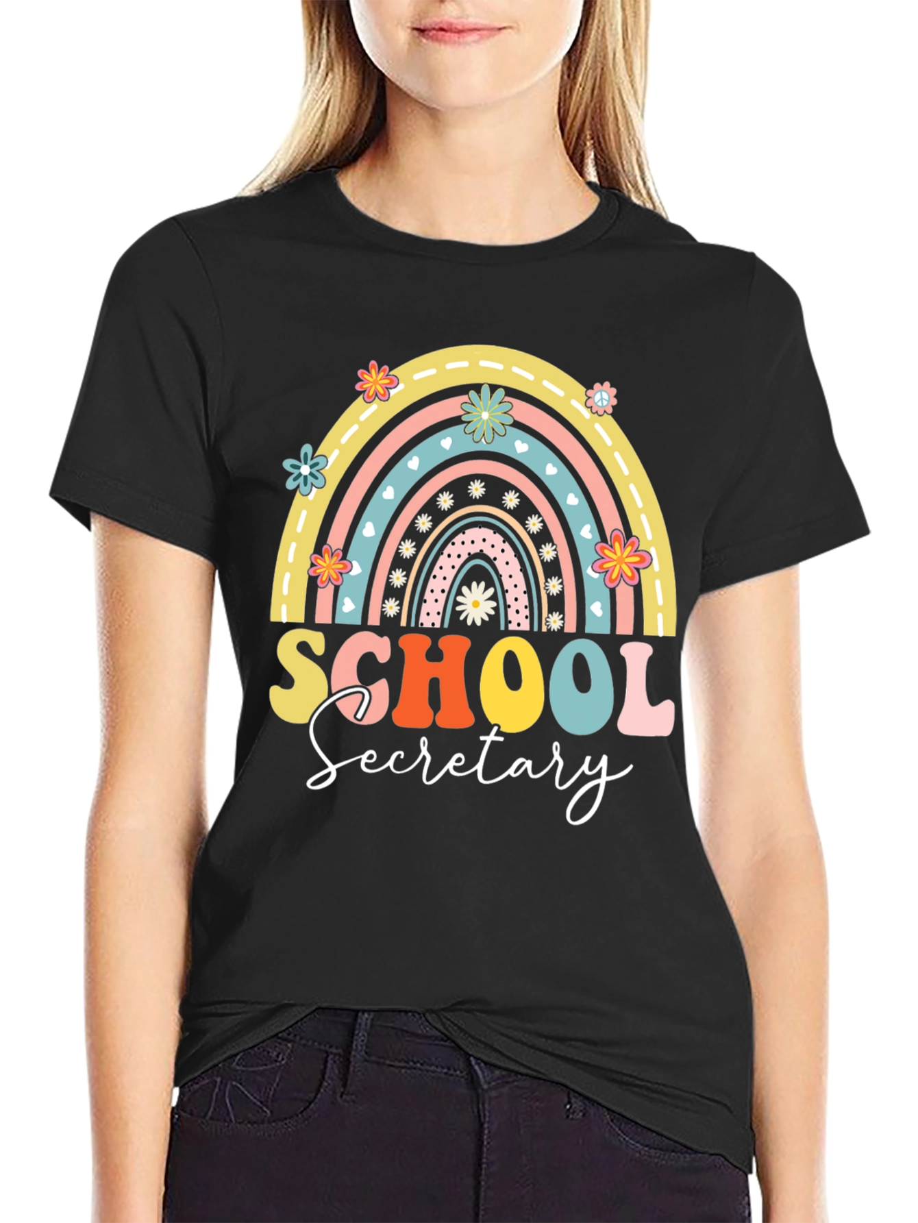 Show your appreciation with this fun School Secretary t-shirt! The tee features a colorful rainbow graphic adorned with flowers, hearts, and a polka-dot design. Bold "SCHOOL" lettering sits above a cursive "Secretary" for easy reading. This comfy tee is great for daily wear around school, casual outings, or appreciation week. Perfect for school secretaries, administrative staff, or anyone who loves a vibrant, positive message. A great gift idea!