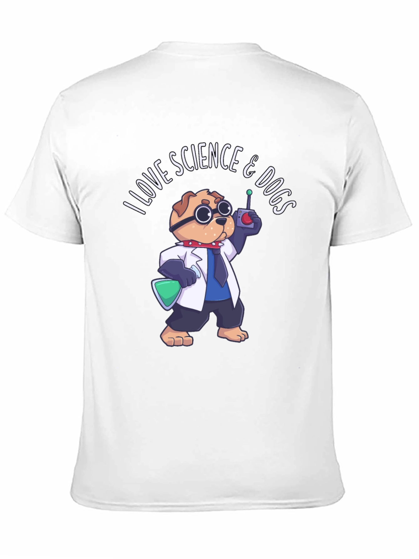 Show off your love for science and dogs with this unique black t-shirt. The tee features a fun graphic of a cartoon dog dressed as a scientist, complete with lab coat, goggles, and scientific equipment. The playful design is complemented by the words "I LOVE SCIENCE & DOGS" printed in a stylish font. Made from comfortable and breathable cotton, this tee is perfect for everyday wear. Its classic black color makes it versatile and easy to pair with jeans, shorts, or casual pants. Whether you're a science enthusiast, a dog lover, or simply appreciate quirky and fun designs, this shirt is sure to be a hit. It's a great conversation starter and a fantastic way to express your personality.