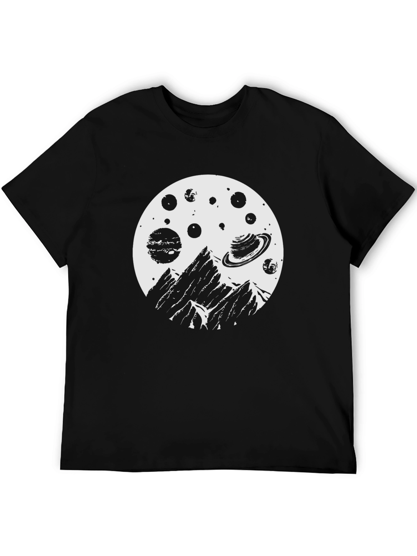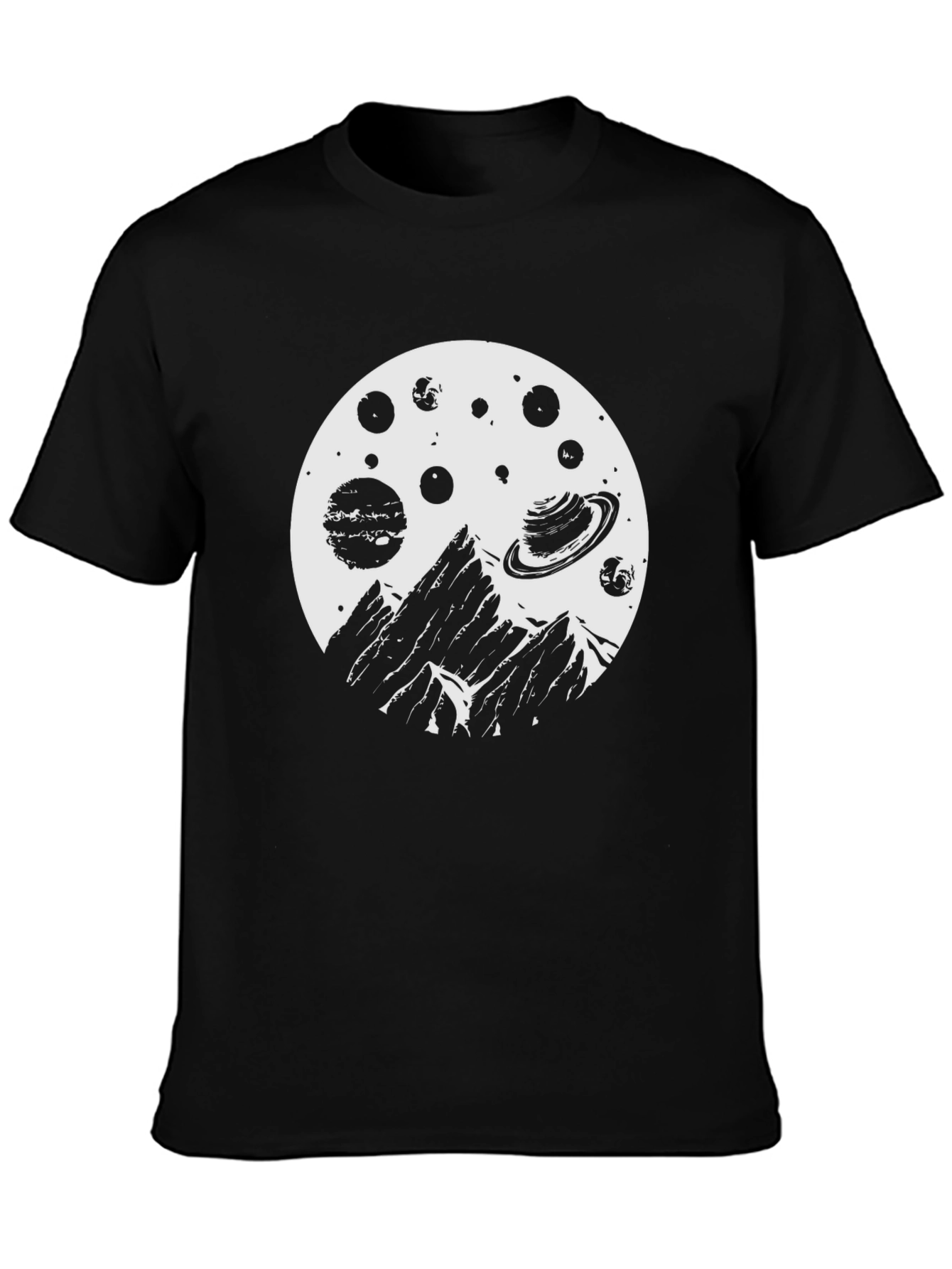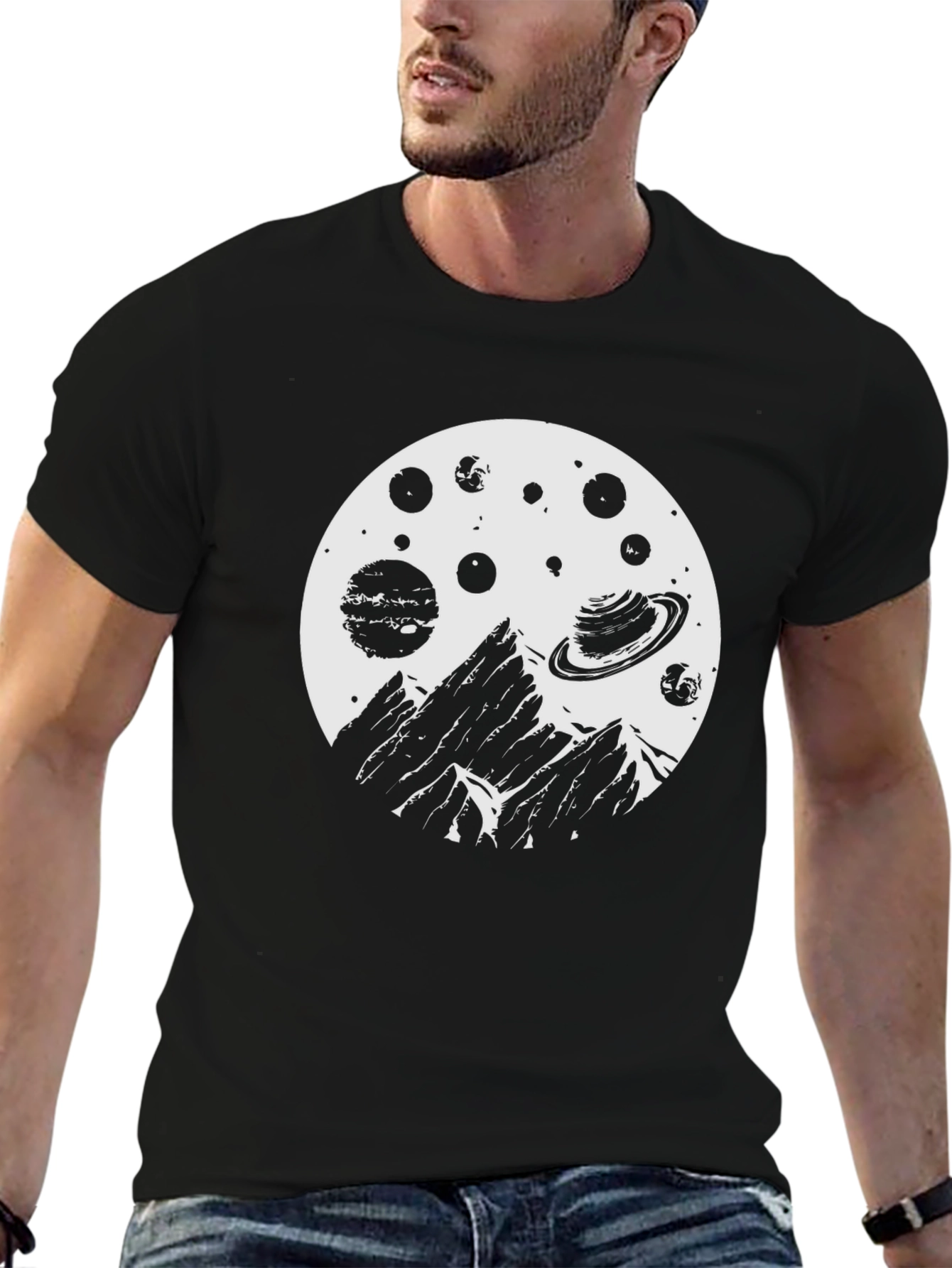 Explore the universe in style with this unique graphic tee. The black t-shirt features a striking white design of jagged mountains set against a backdrop of planets and stars, creating a mesmerizing celestial scene. Made from a soft and comfortable fabric, this shirt is perfect for everyday wear. Showcase your love for astronomy or add an edgy twist to your wardrobe. Ideal for casual outings, concerts, or simply lounging at home. A definite conversation starter! Get yours now and journey beyond the stars.