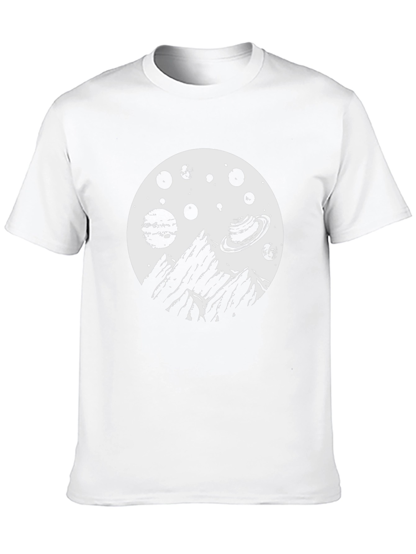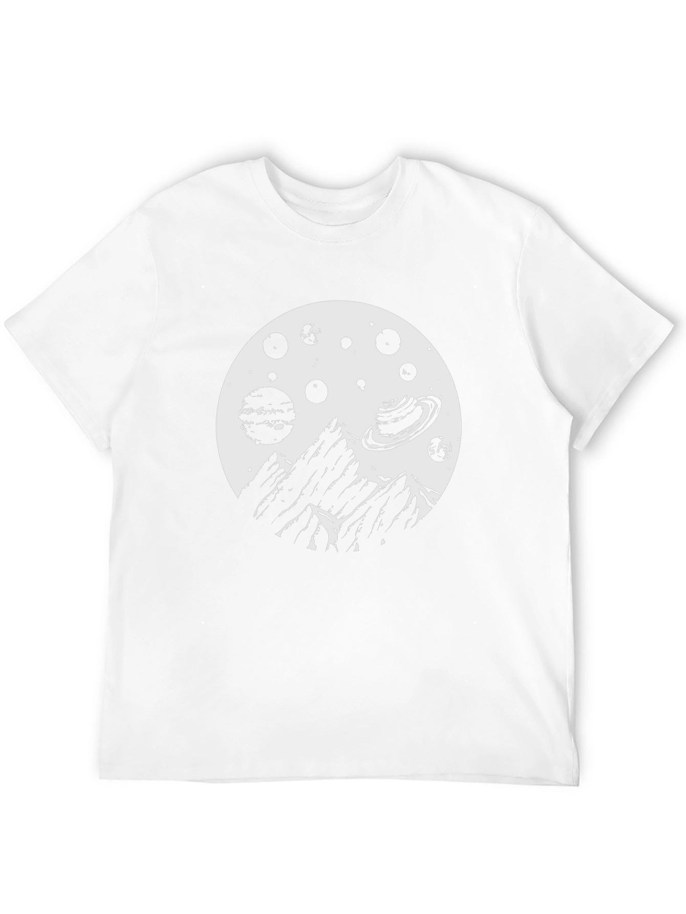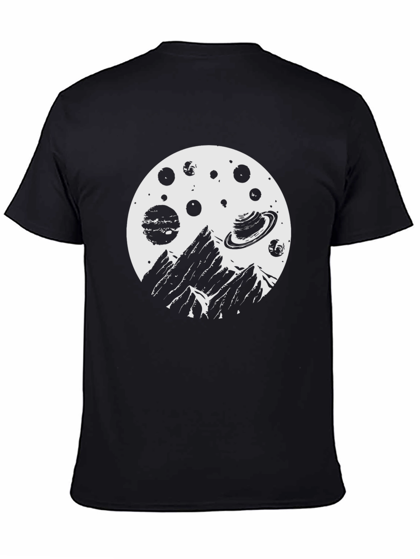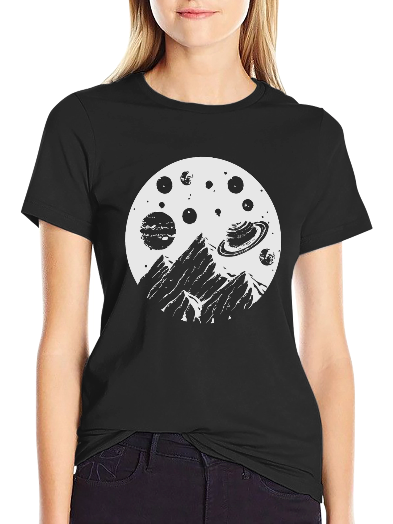 Explore the universe in style with this unique graphic tee. The black t-shirt features a striking white design of jagged mountains set against a backdrop of planets and stars, creating a mesmerizing celestial scene. Made from a soft and comfortable fabric, this shirt is perfect for everyday wear. Showcase your love for astronomy or add an edgy twist to your wardrobe. Ideal for casual outings, concerts, or simply lounging at home. A definite conversation starter! Get yours now and journey beyond the stars.