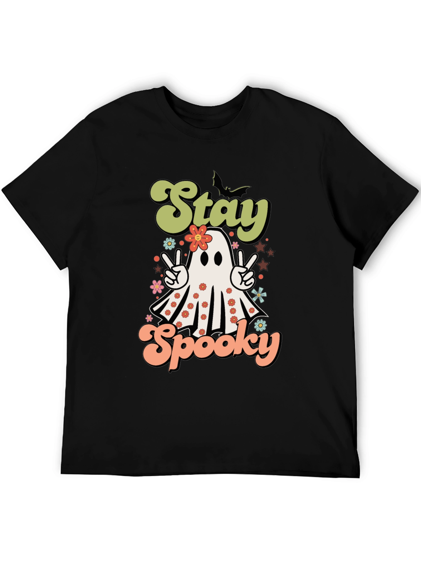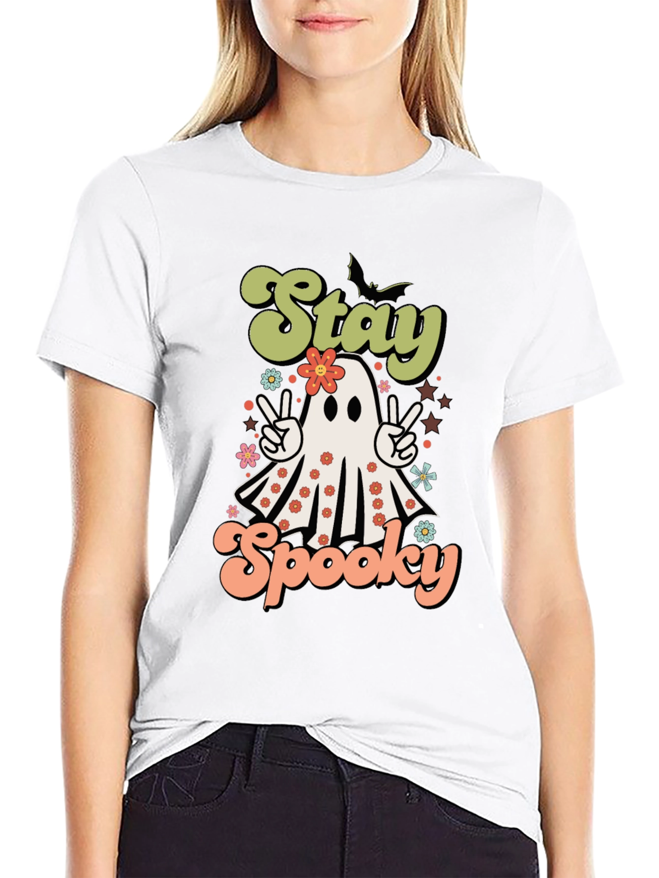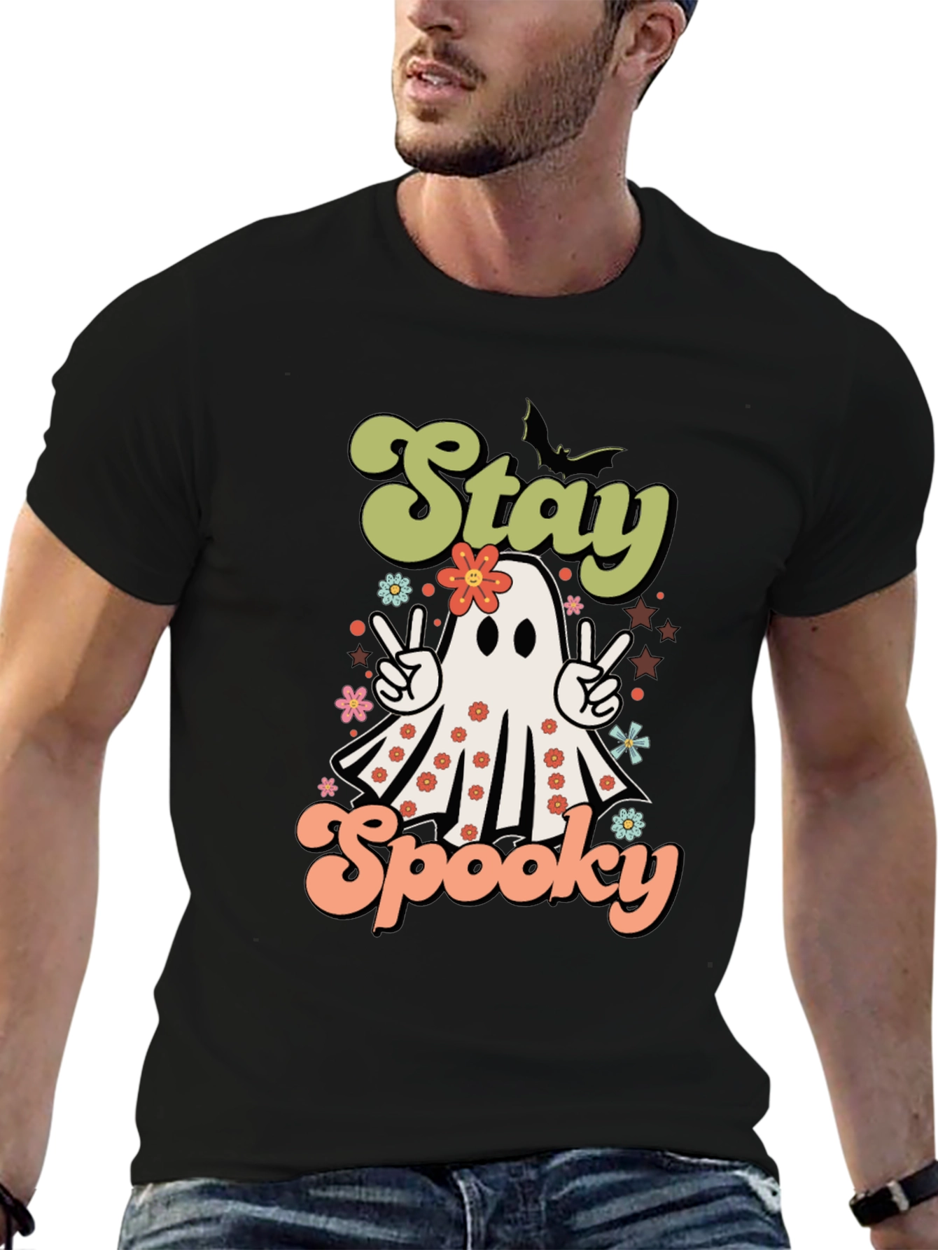 Get ready for Halloween with this retro-inspired t-shirt! Featuring a charming ghost graphic adorned with flowers, this tee brings a playful spooky vibe. The text "Stay Spooky" adds a fun touch. Made from a comfortable material, this black t-shirt is perfect for casual wear during the Halloween season or any time you want to express your love for the supernatural. Pair it with jeans for a laid-back look, or dress it up with a jacket for a Halloween party. A must-have for anyone who loves Halloween!