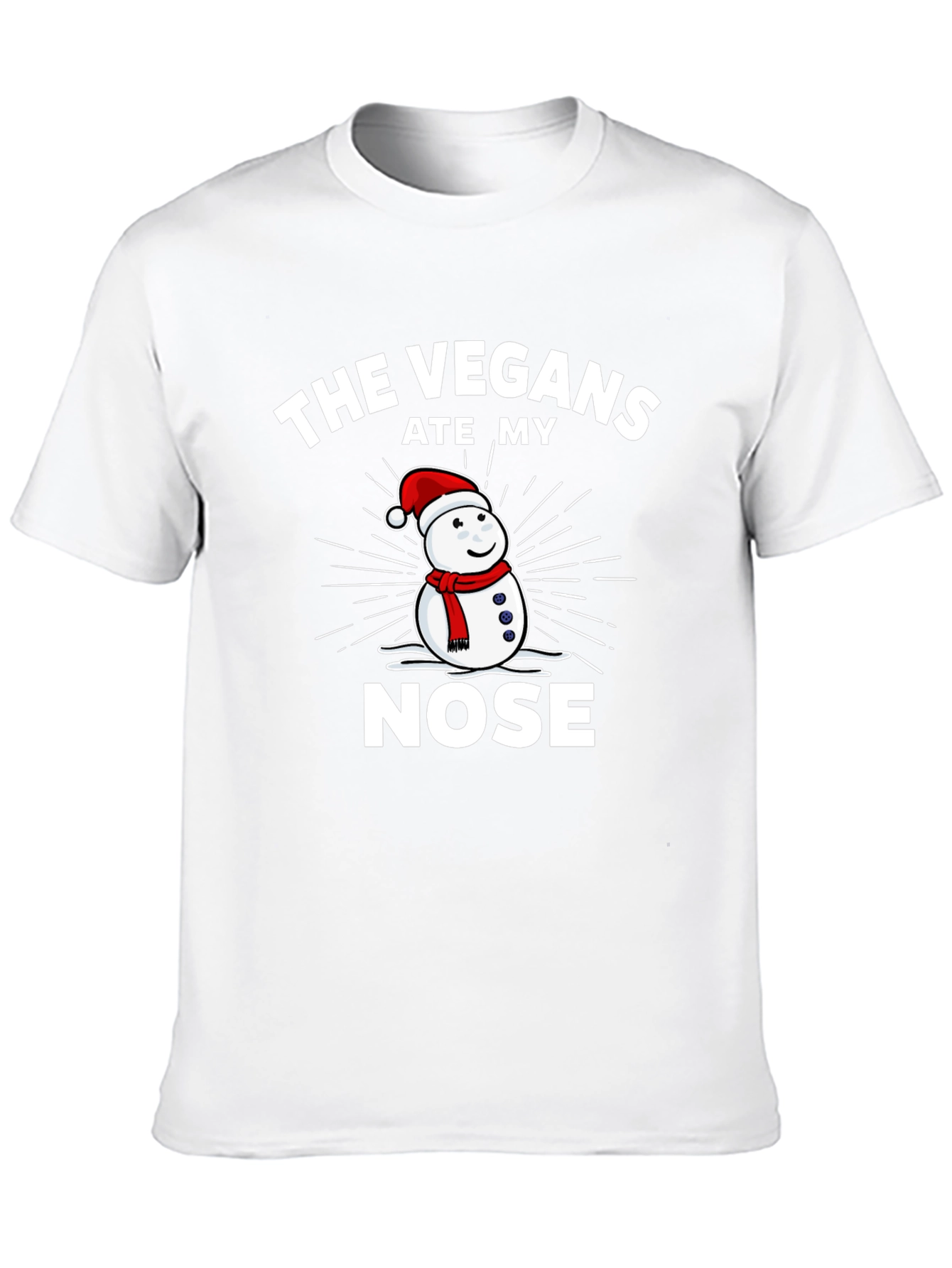 This black t-shirt features a humorous graphic design with a snowman wearing a Santa hat and a red scarf. Above the snowman, the phrase "THE VEGANS" is printed in bold white letters, followed by "ATE MY" and "NOSE" below. The design suggests a playful jab at vegan diets, implying that the snowman's carrot nose has been eaten. The shirt is made of a soft-looking cotton blend. This t-shirt is perfect for casual wear, holiday parties, or as a gag gift for friends and family with a sense of humor. It's a fun way to spread some laughter and spark conversations!